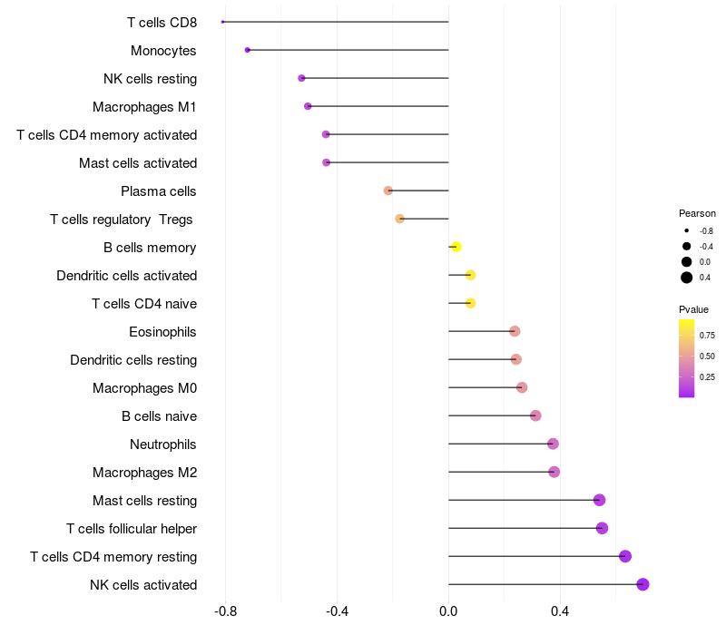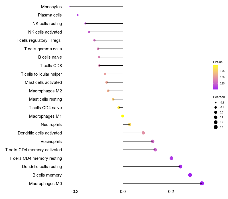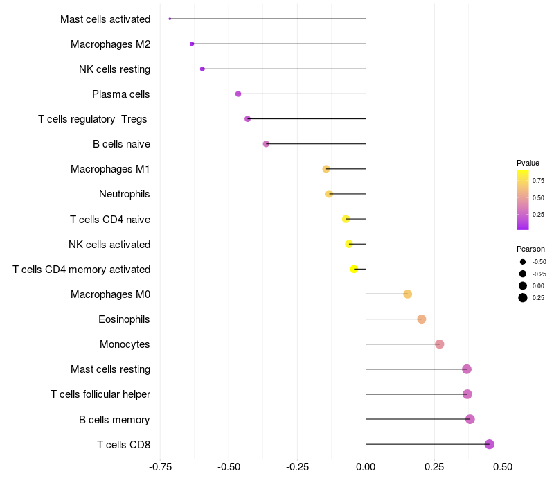 Lollipop of ZNF131 expression and immune infiltrating cell level correlation result in HBV+ Chronic HBV (CHB) infection samples