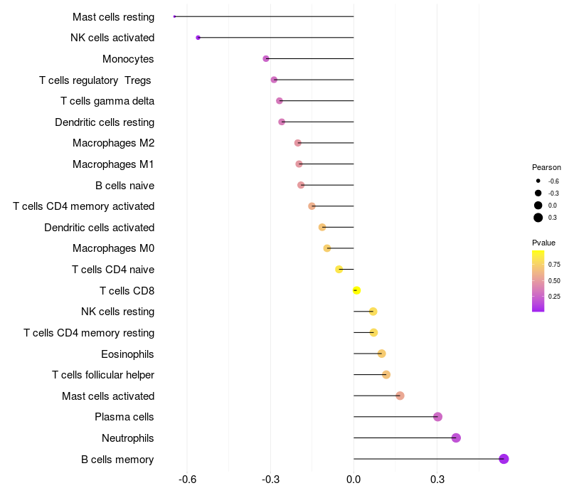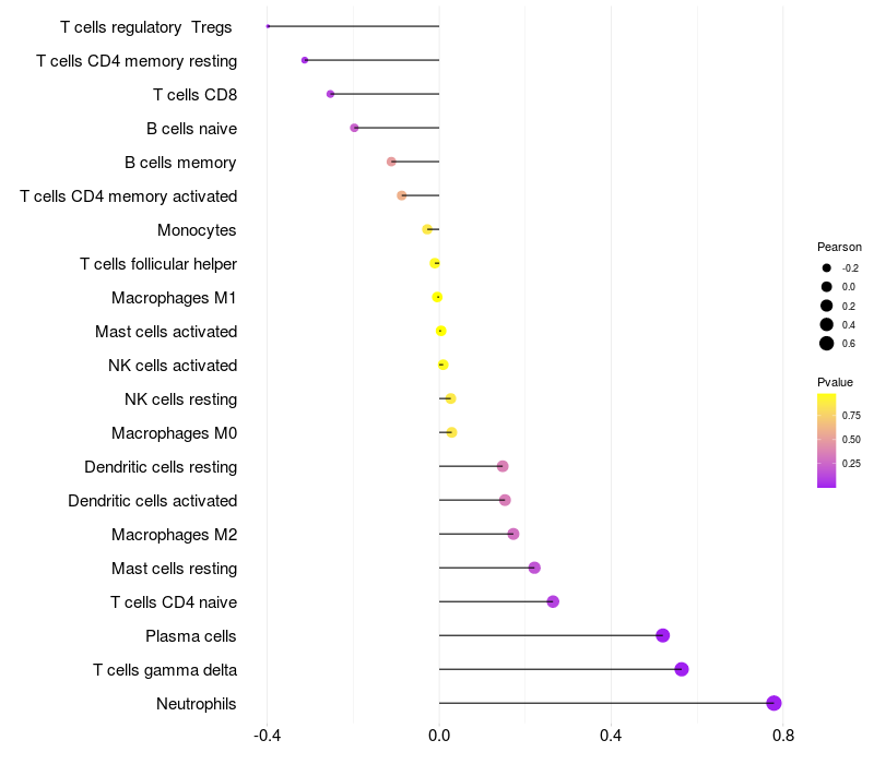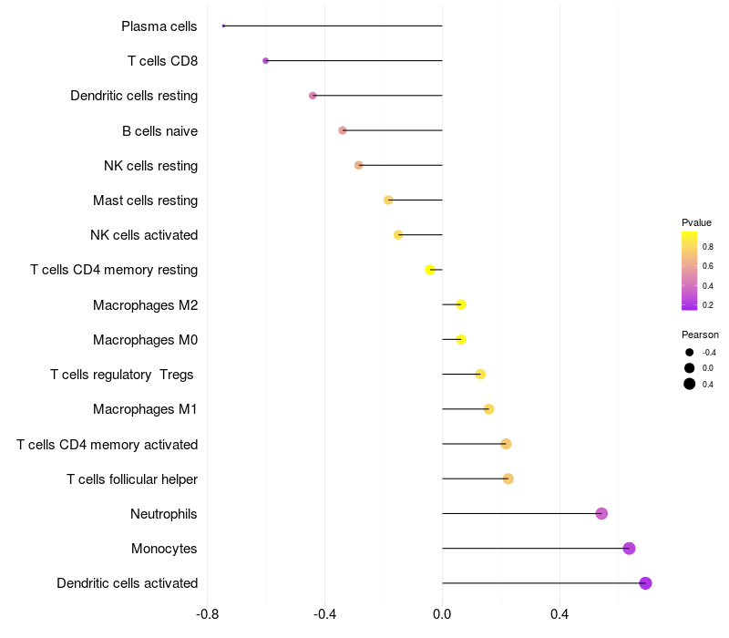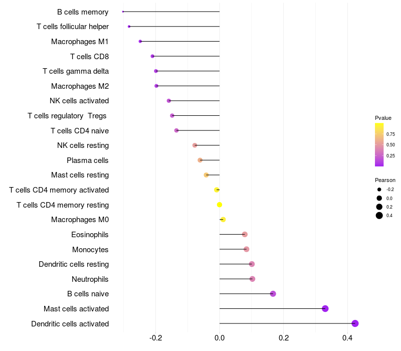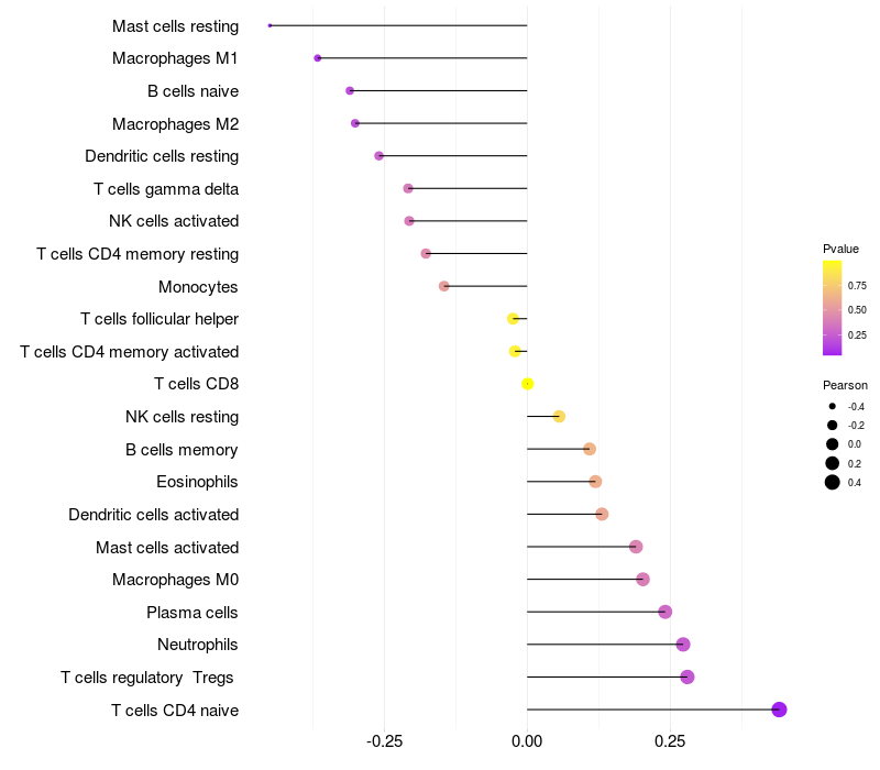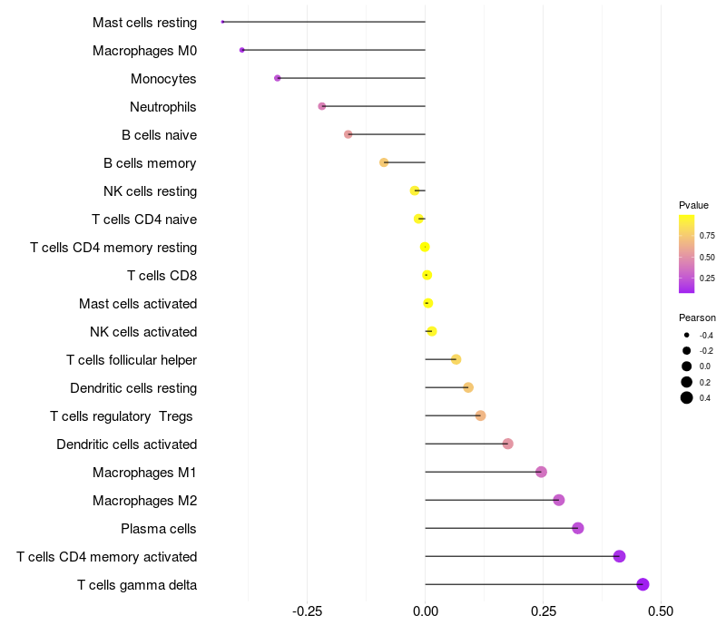 Lollipop of ZNF165 expression and immune infiltrating cell level correlation result in HPV+ samples