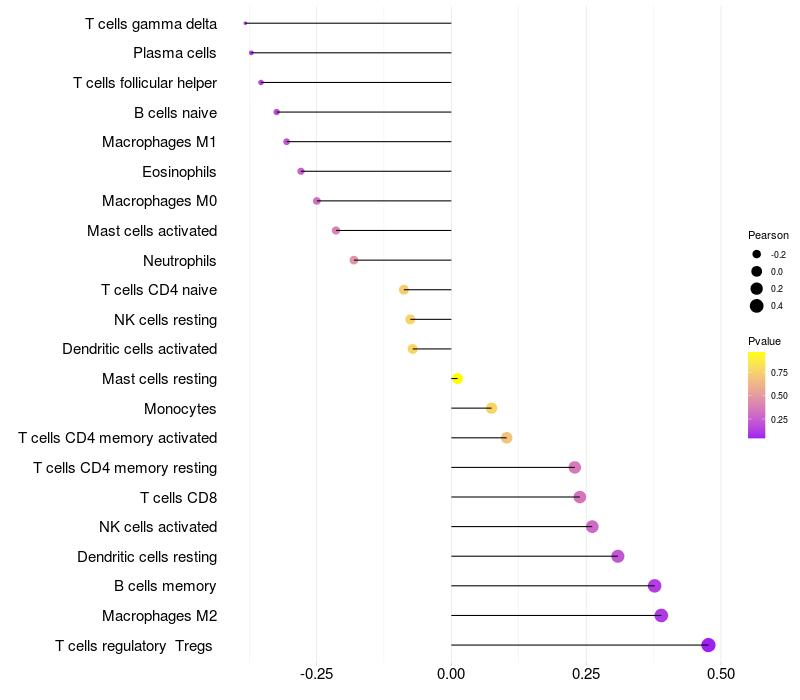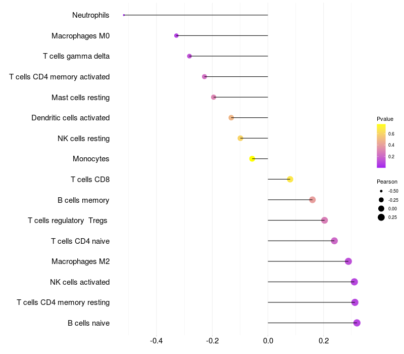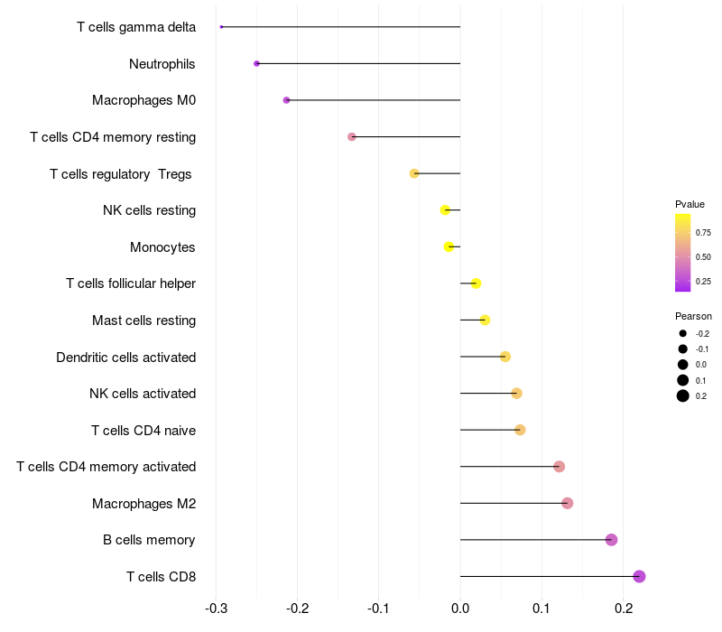 Lollipop of ZNF202 expression and immune infiltrating cell level correlation result in HTLV1+ samples
