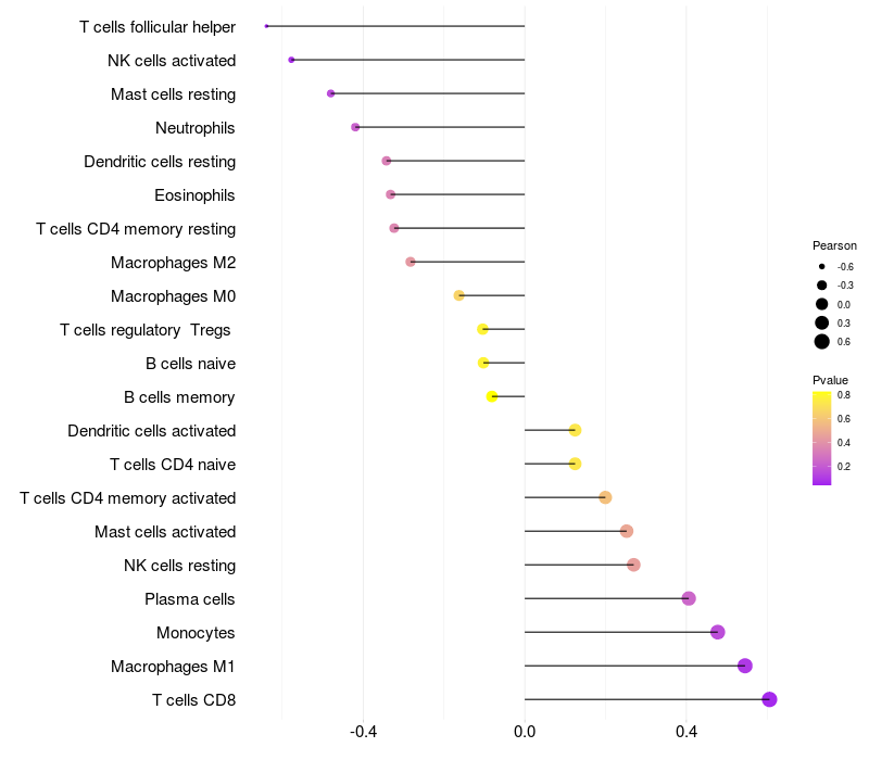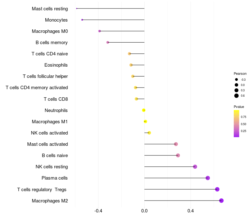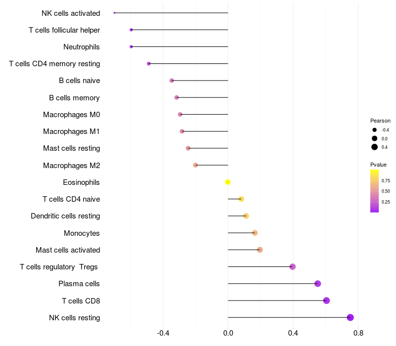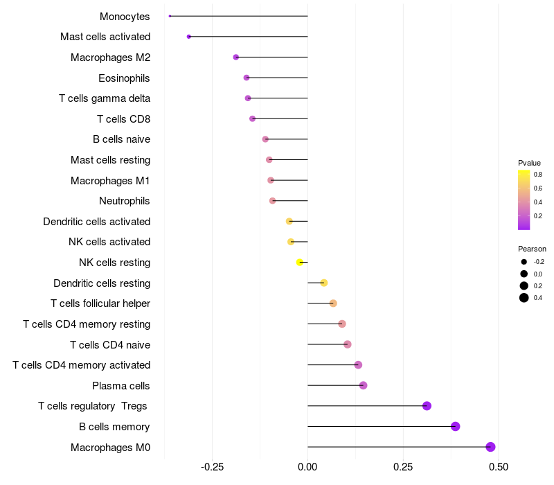Lollipop of ZNF250 expression and immune infiltrating cell level correlation result in HBV+ Liver cirrhosis samples