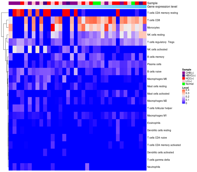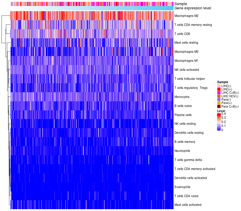 Liver hepatocellular carcinoma HCV (HBV+)(86), Liver hepatocellular carcinoma HCV (HBV-)(19), Liver hepatocellular carcinoma (HBV+)(209), Liver hepatocellular carcinoma (HBV+)(60), Paracancerous HCV (HBV+)(4), Paracancerous (HBV-)(28), Paracancerous (HBV+)(18) |