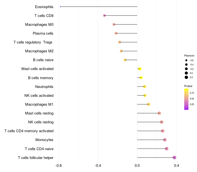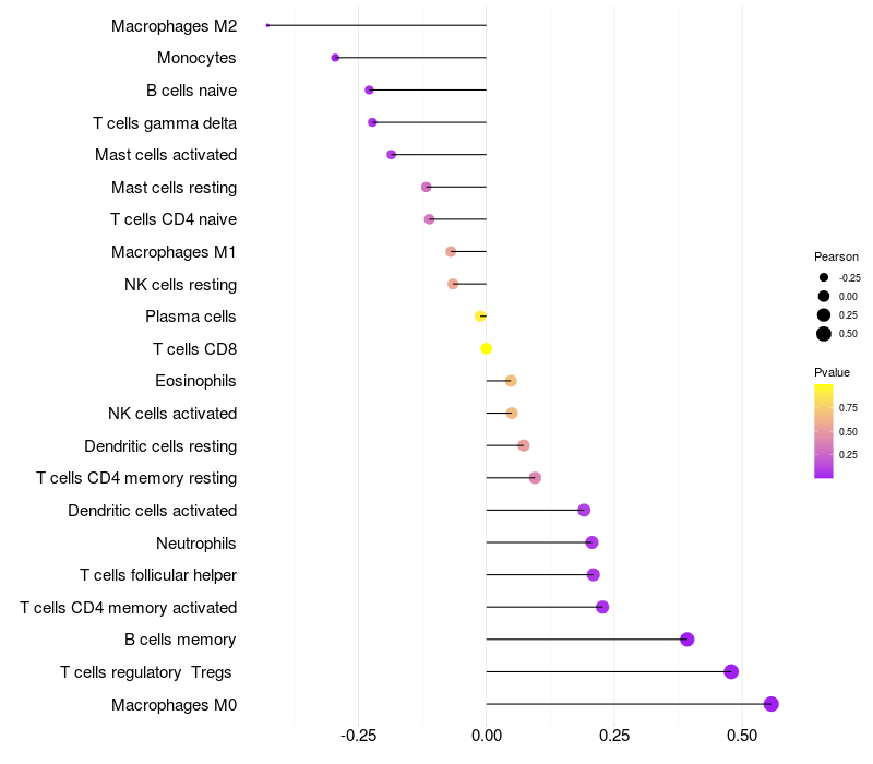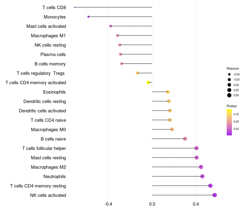 Lollipop of ZNF26 expression and immune infiltrating cell level correlation result in HBV+ Liver cirrhosis samples