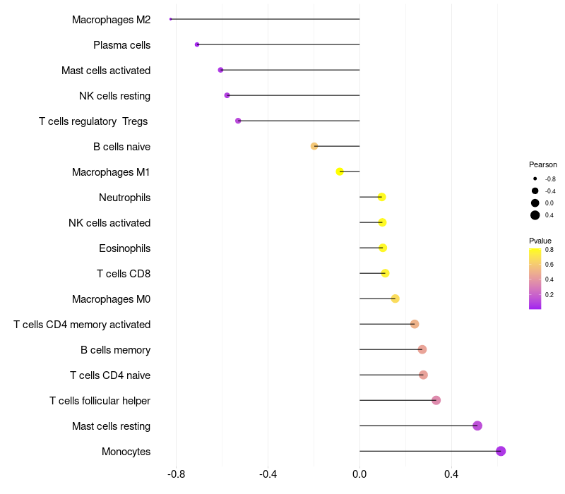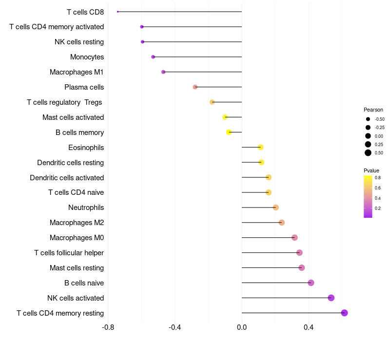 Lollipop of ZNF281 expression and immune infiltrating cell level correlation result in HBV+ Liver cirrhosis samples
