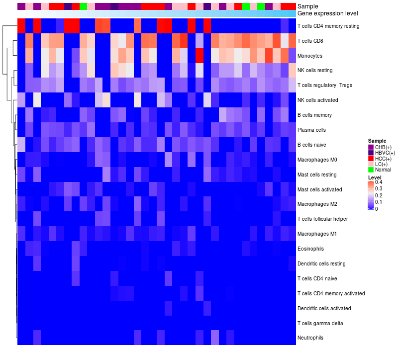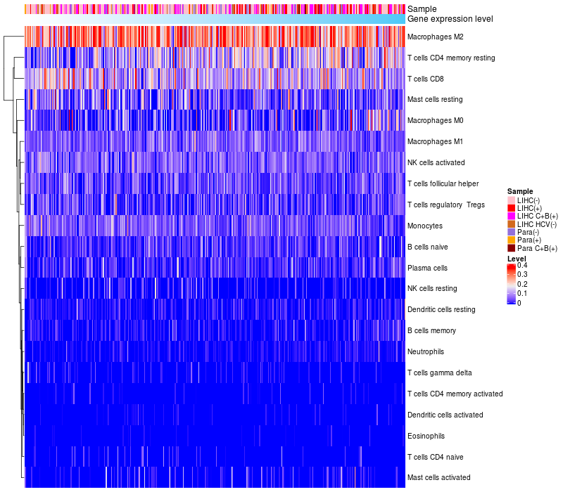 Liver hepatocellular carcinoma HCV (HBV+)(86), Liver hepatocellular carcinoma HCV (HBV-)(19), Liver hepatocellular carcinoma (HBV+)(209), Liver hepatocellular carcinoma (HBV+)(60), Paracancerous HCV (HBV+)(4), Paracancerous (HBV-)(28), Paracancerous (HBV+)(18) |