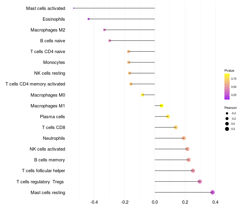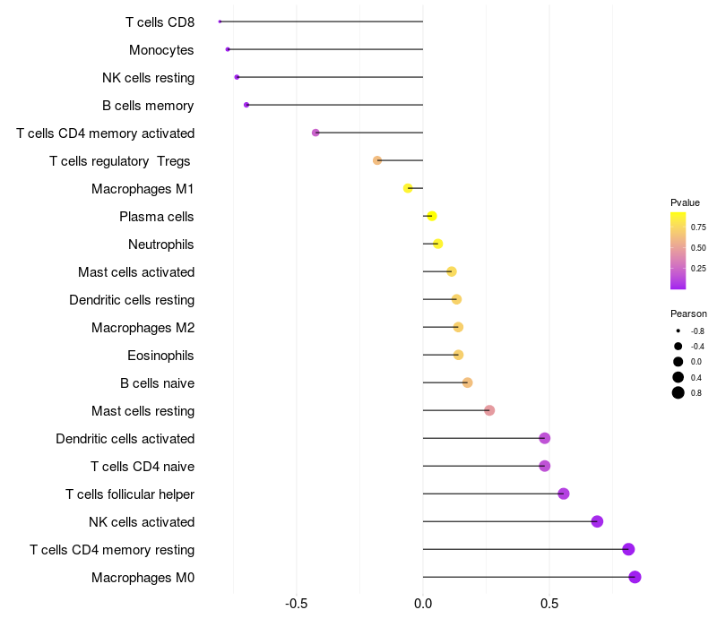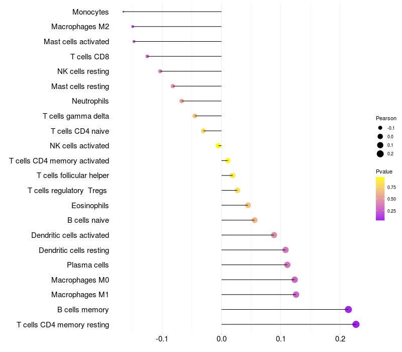 Lollipop of ZNF304 expression and immune infiltrating cell level correlation result in HBV+ Chronic HBV (CHB) infection samples