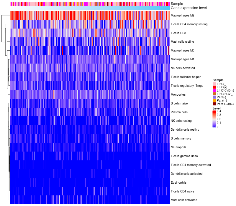 Liver hepatocellular carcinoma HCV (HBV+)(86), Liver hepatocellular carcinoma HCV (HBV-)(19), Liver hepatocellular carcinoma (HBV+)(209), Liver hepatocellular carcinoma (HBV+)(60), Paracancerous HCV (HBV+)(4), Paracancerous (HBV-)(28), Paracancerous (HBV+)(18) |