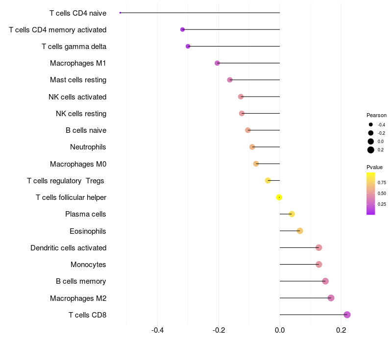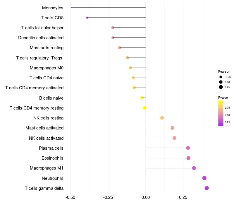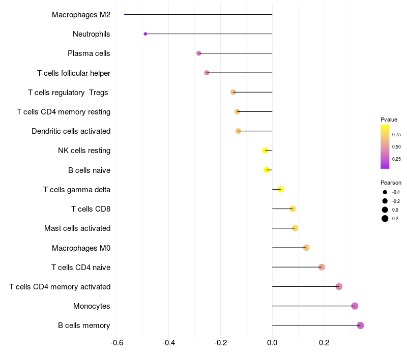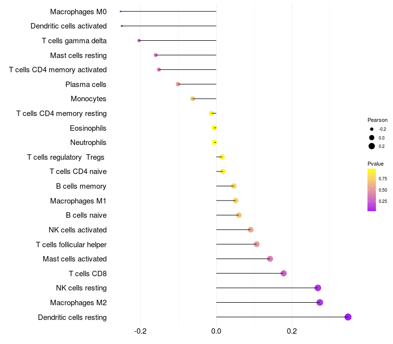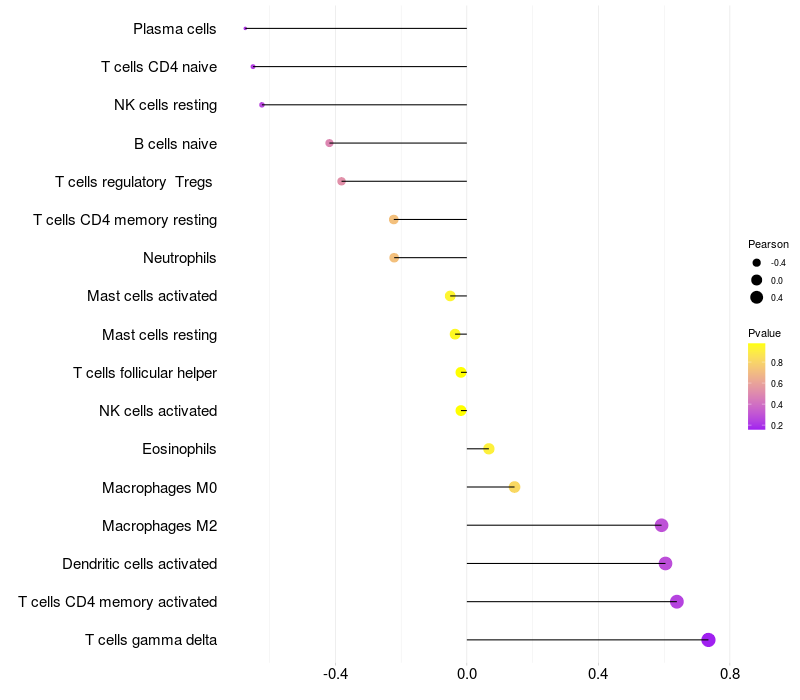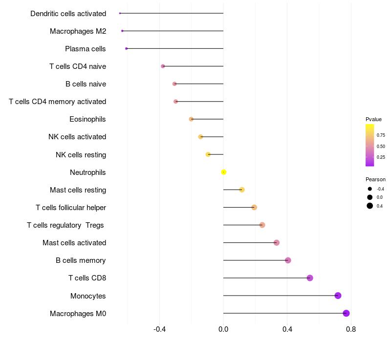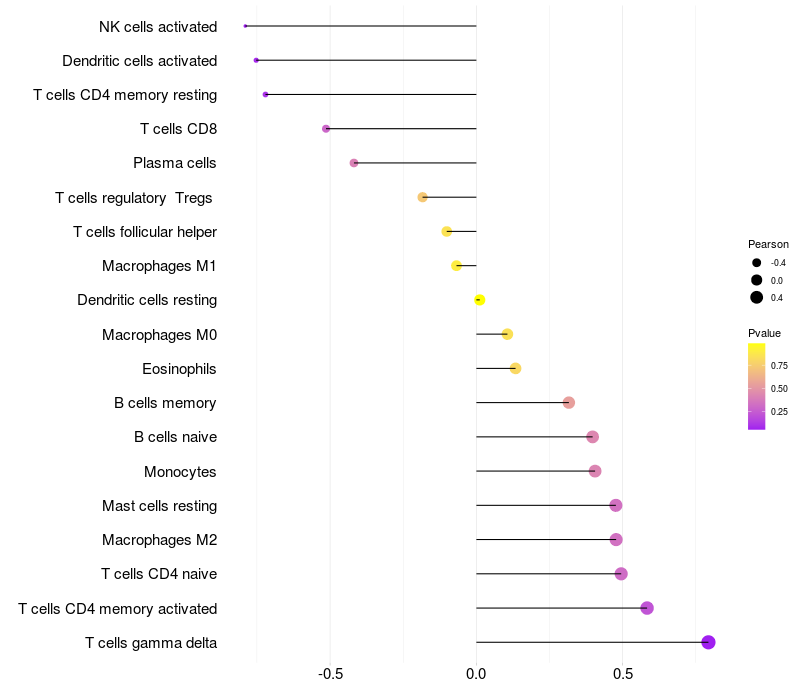 Lollipop of ZNF365 expression and immune infiltrating cell level correlation result in EBV+ samples