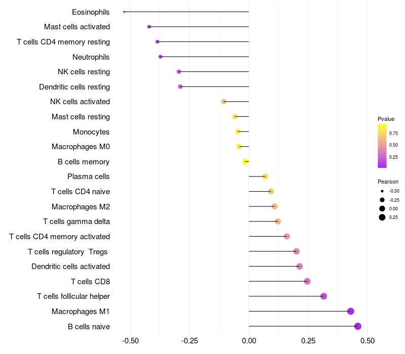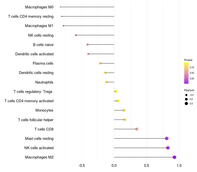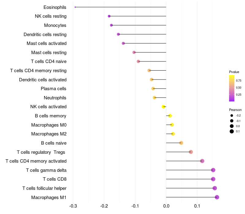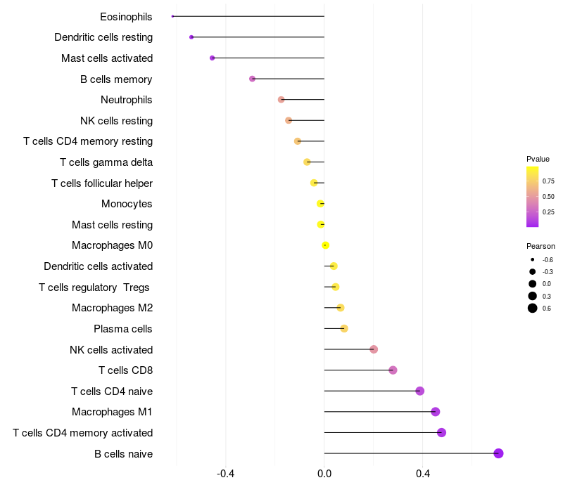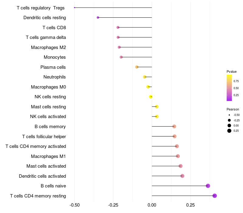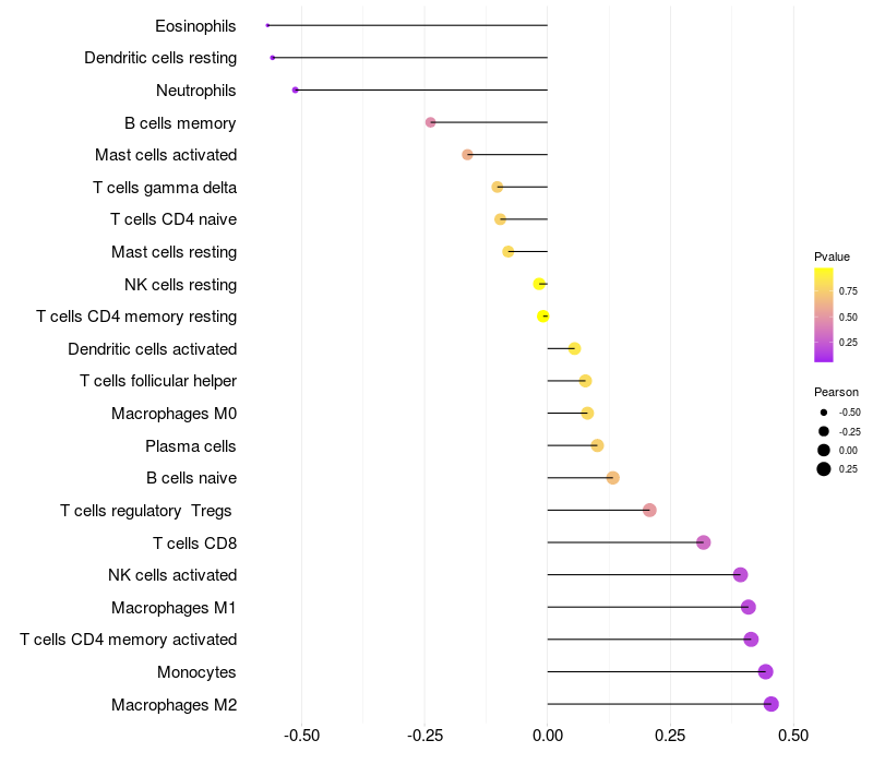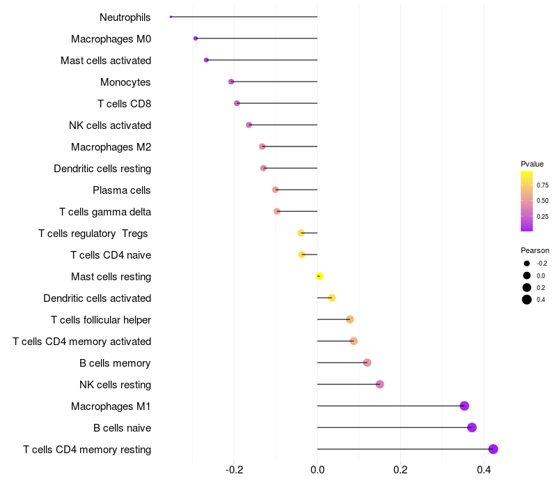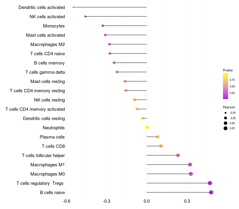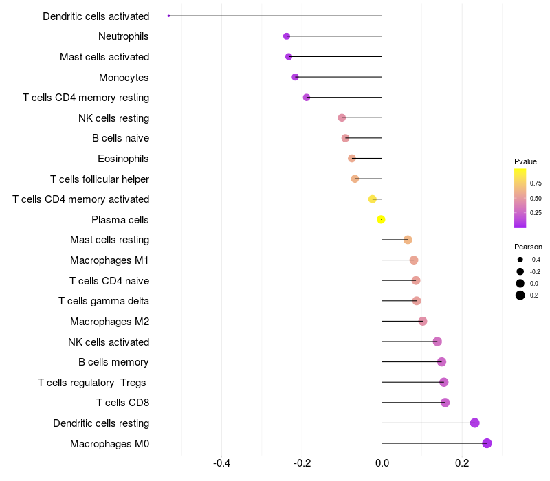 Lollipop of ZNF37A expression and immune infiltrating cell level correlation result in HPV+ samples