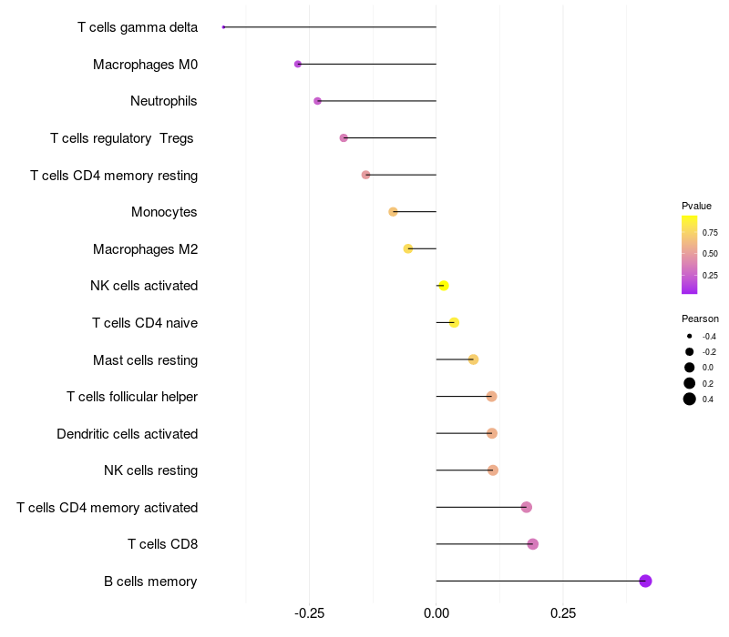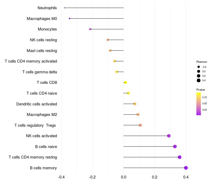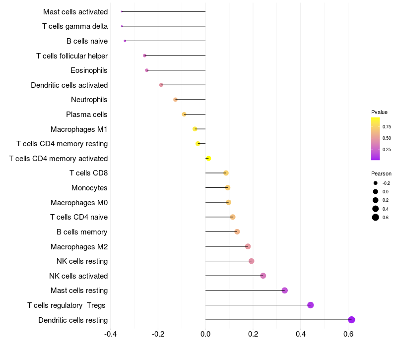 Lollipop of ZNF414 expression and immune infiltrating cell level correlation result in HTLV1+ samples