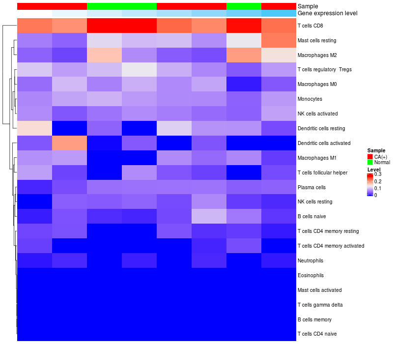 • Left: Heatmap of target gene expression and the level of various types of immune cells (cell type fractions) in all samples based on CIBERSORT method.