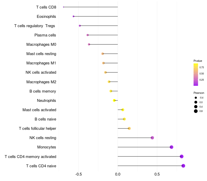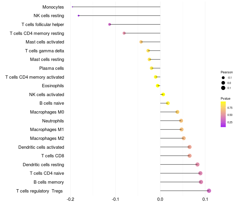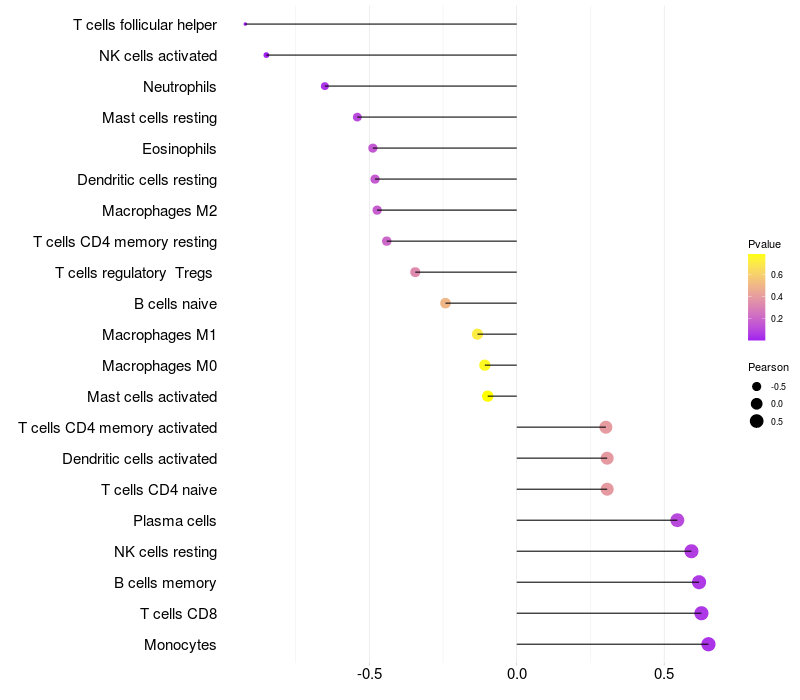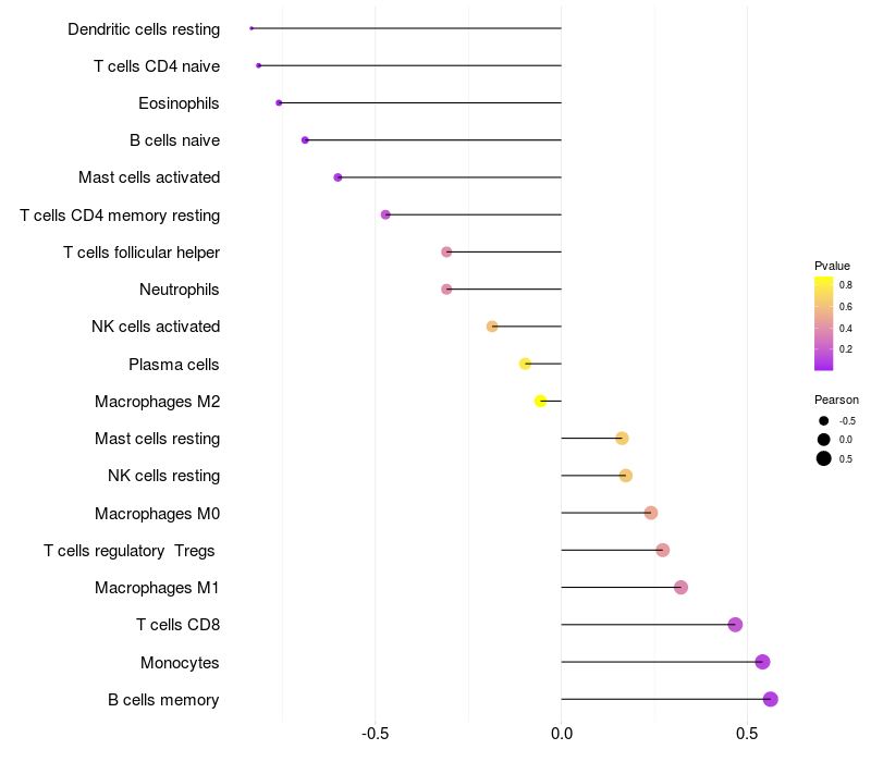 Lollipop of ZNF516 expression and immune infiltrating cell level correlation result in HBV+ Liver cirrhosis samples