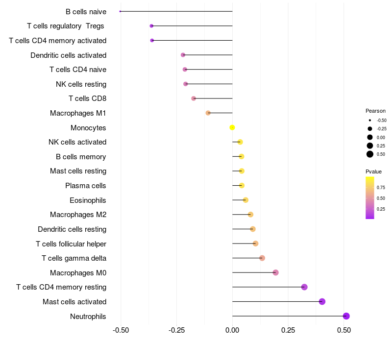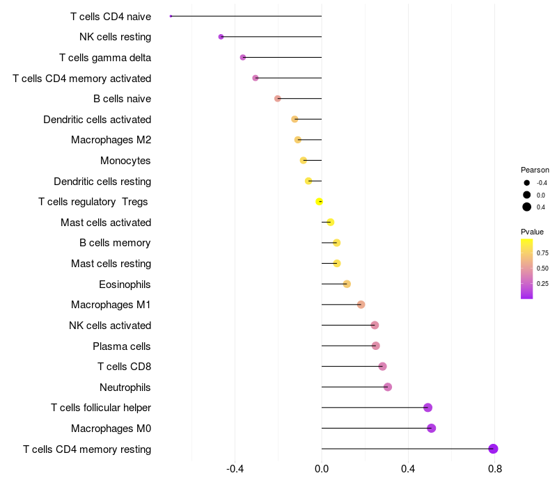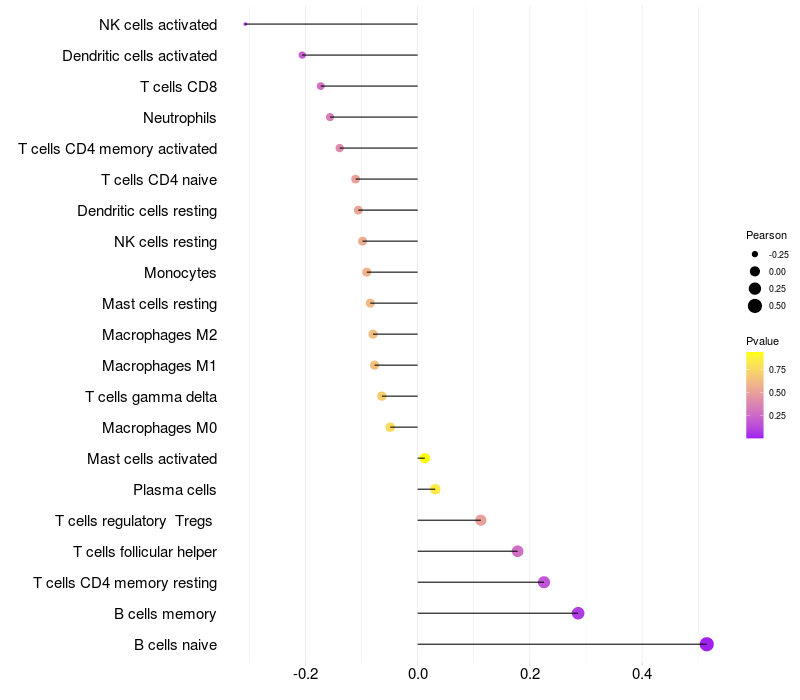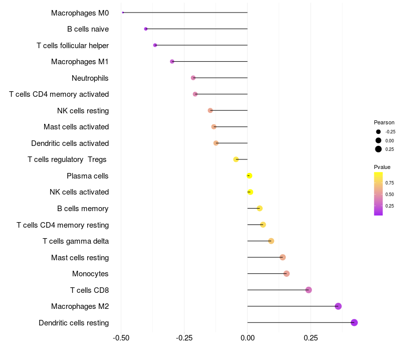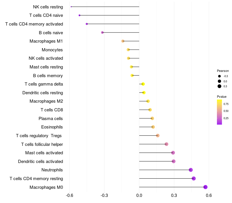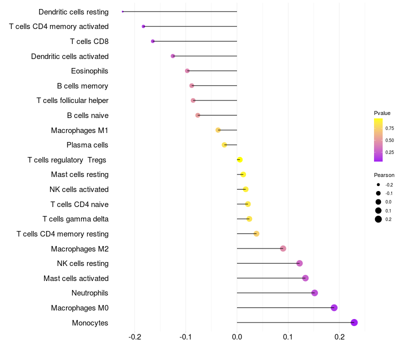 Lollipop of ZNF521 expression and immune infiltrating cell level correlation result in HPV+ samples