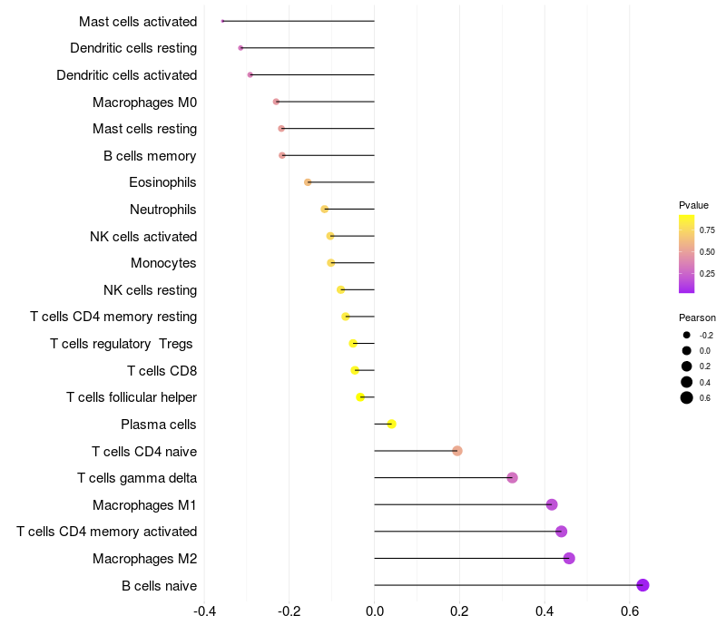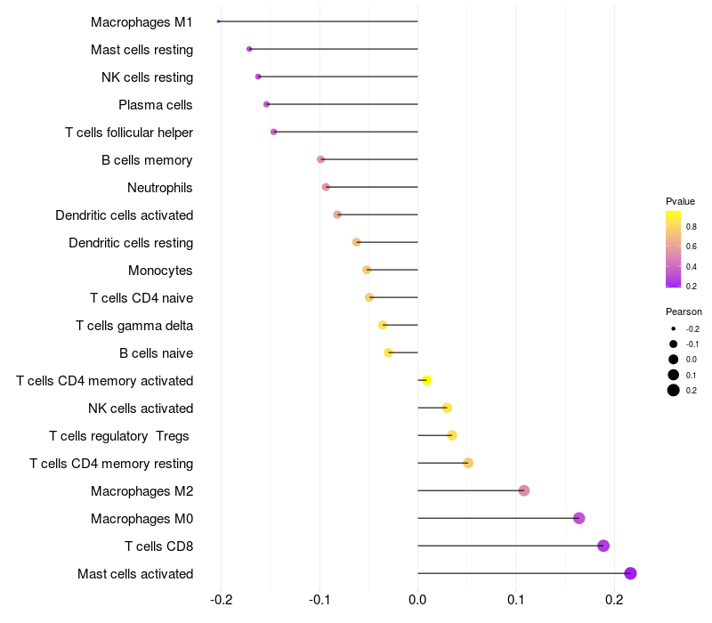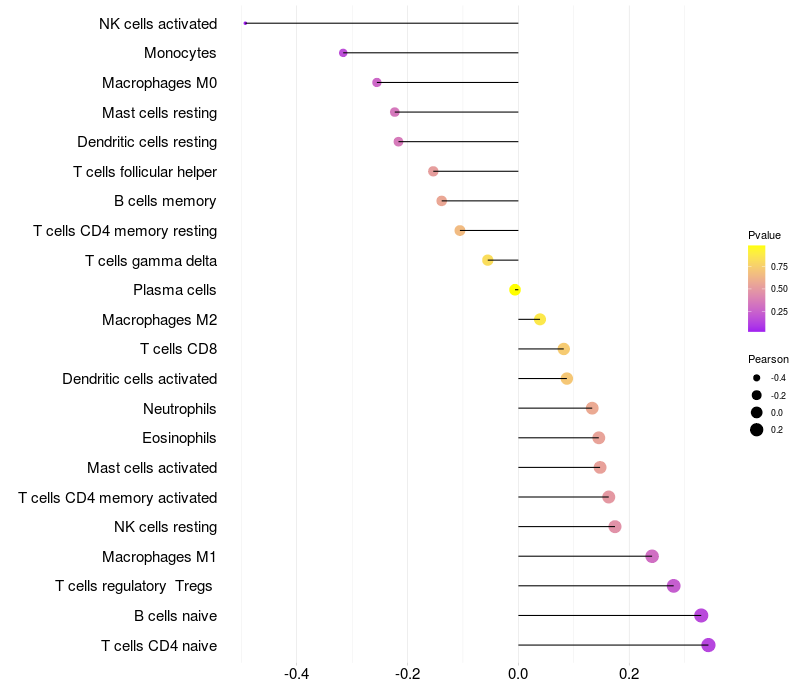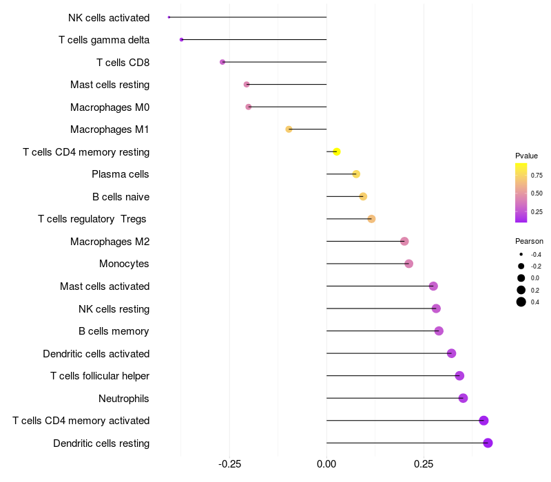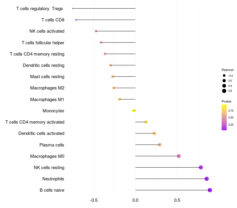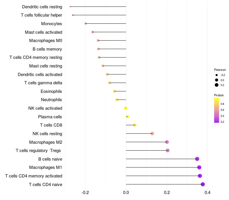 Lollipop of ZNF560 expression and immune infiltrating cell level correlation result in HPV+ samples