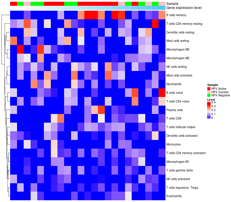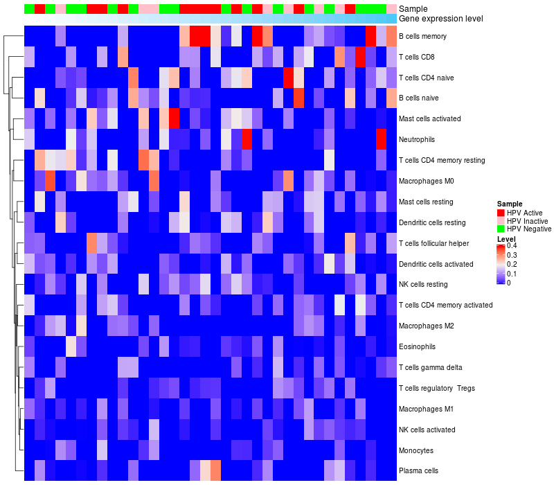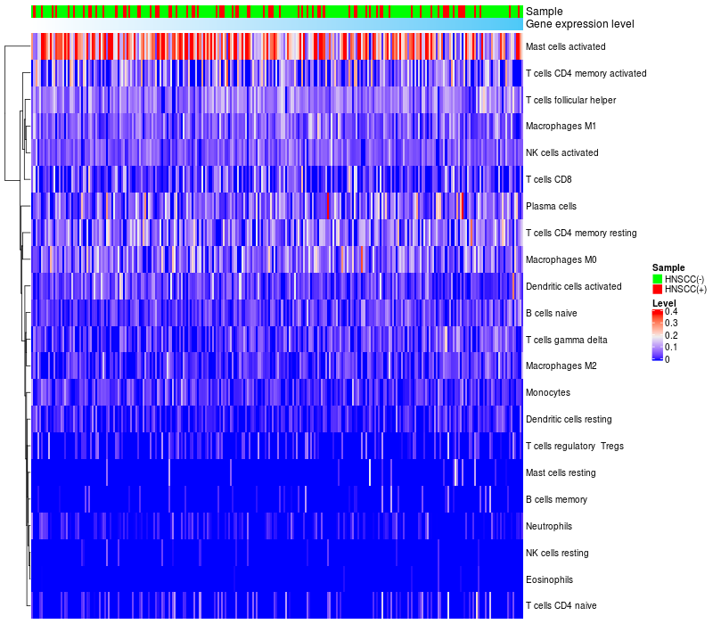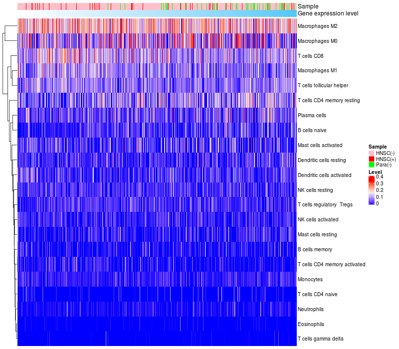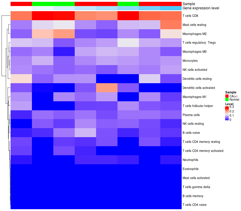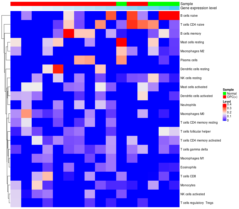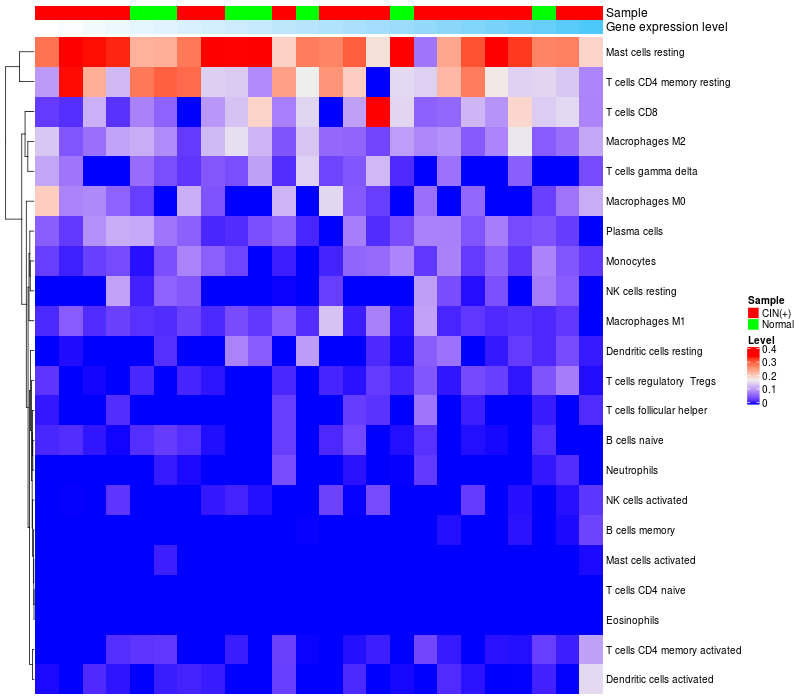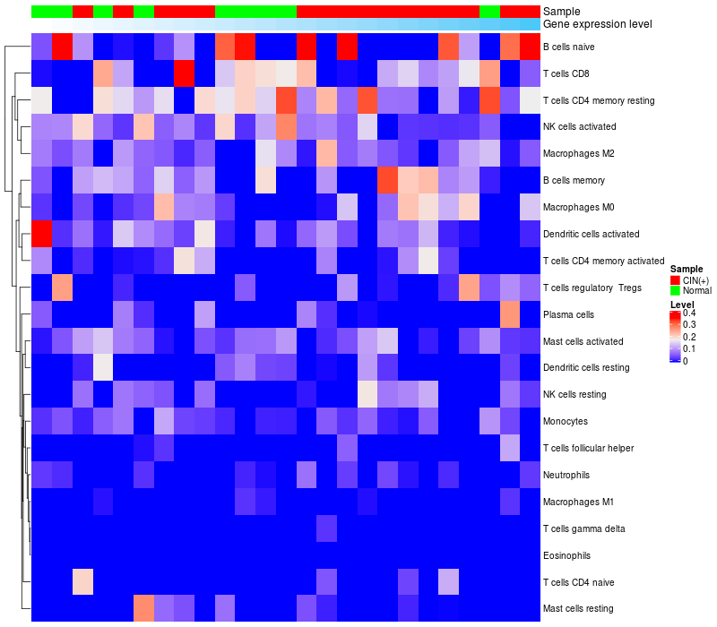 • Left: Heatmap of target gene expression and the level of various types of immune cells (cell type fractions) in all samples based on CIBERSORT method.