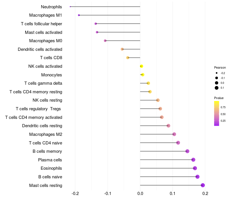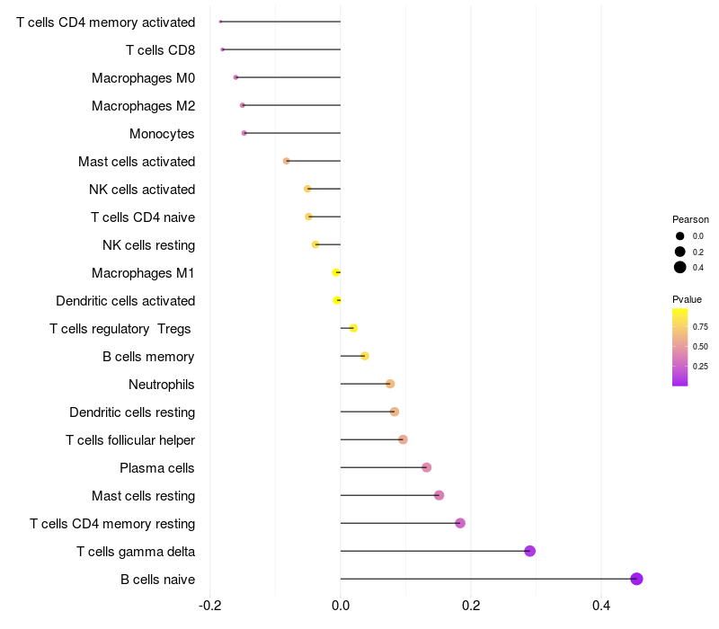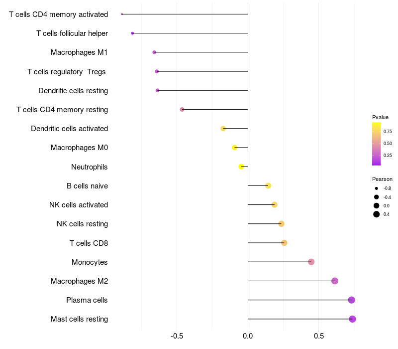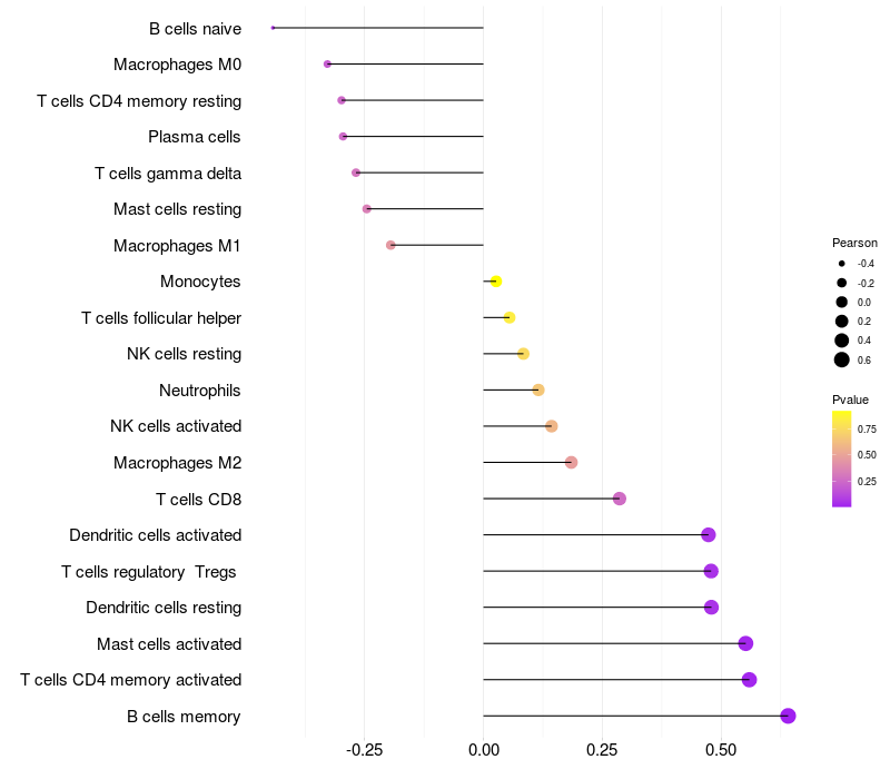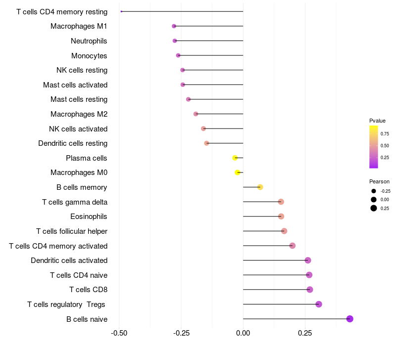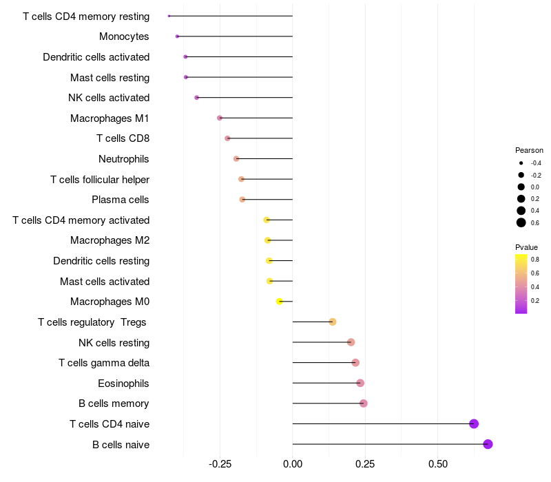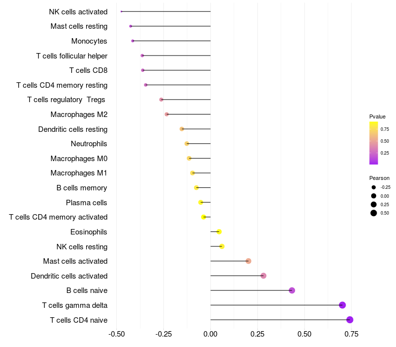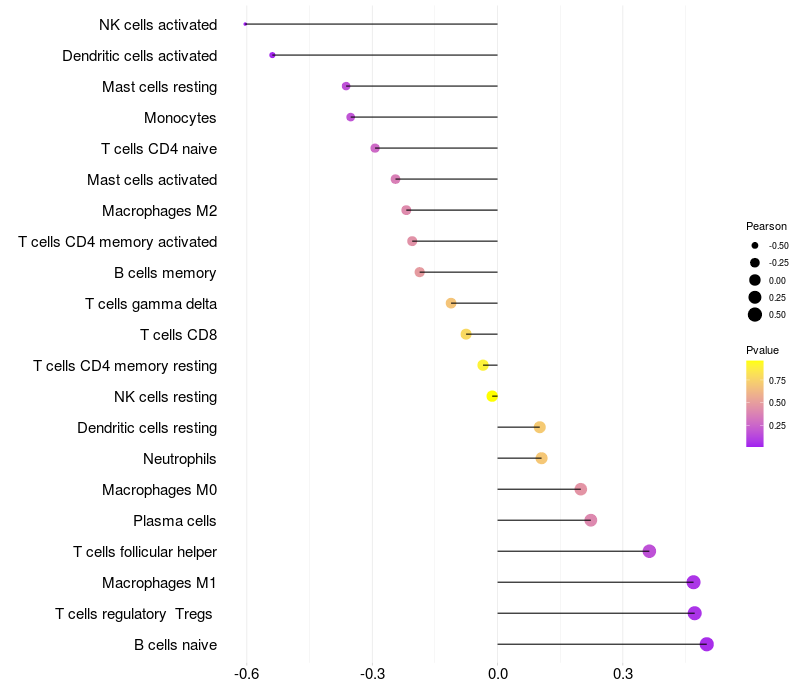 • Right: Correlation of target gene expression and the level of various types of immune cells in virus positive samples (Pearson Correlation Coefficient).