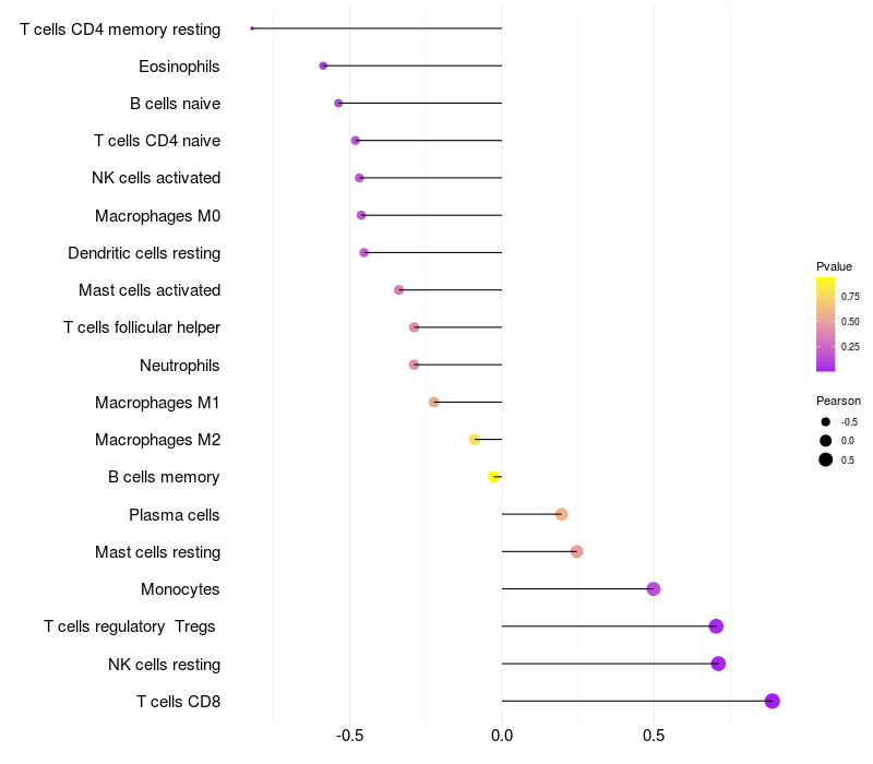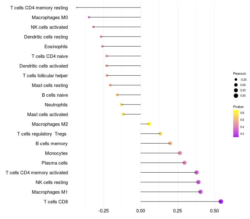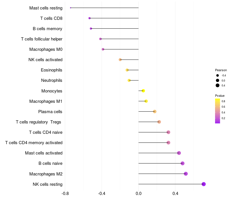 Lollipop of ZNF704 expression and immune infiltrating cell level correlation result in HBV+ Liver cirrhosis samples
