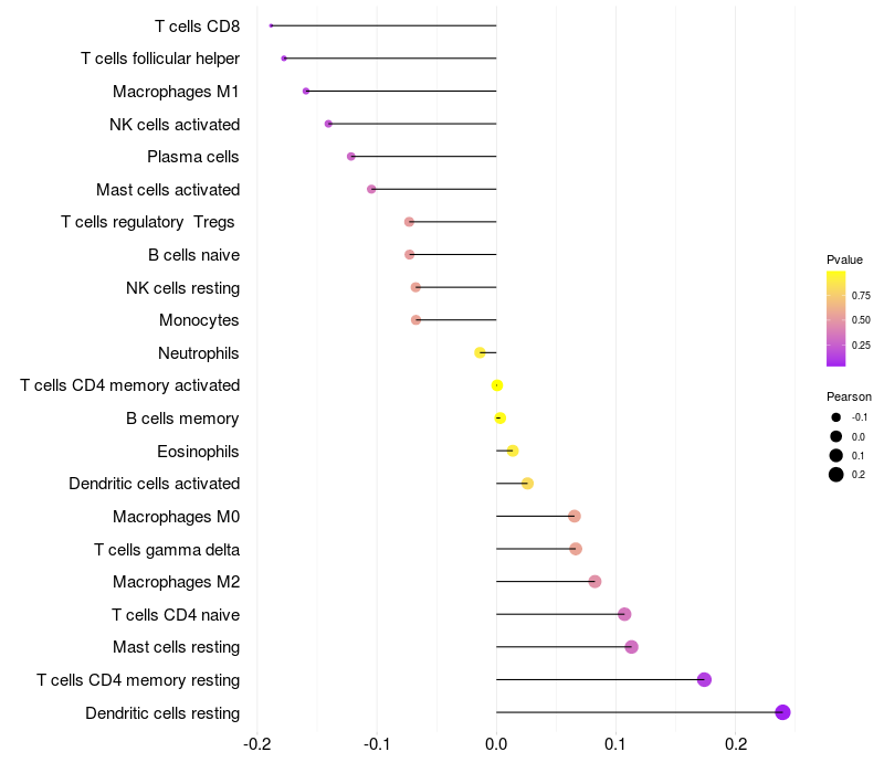 Lollipop of ZNF704 expression and immune infiltrating cell level correlation result in HBV+ Chronic HBV (CHB) infection samples