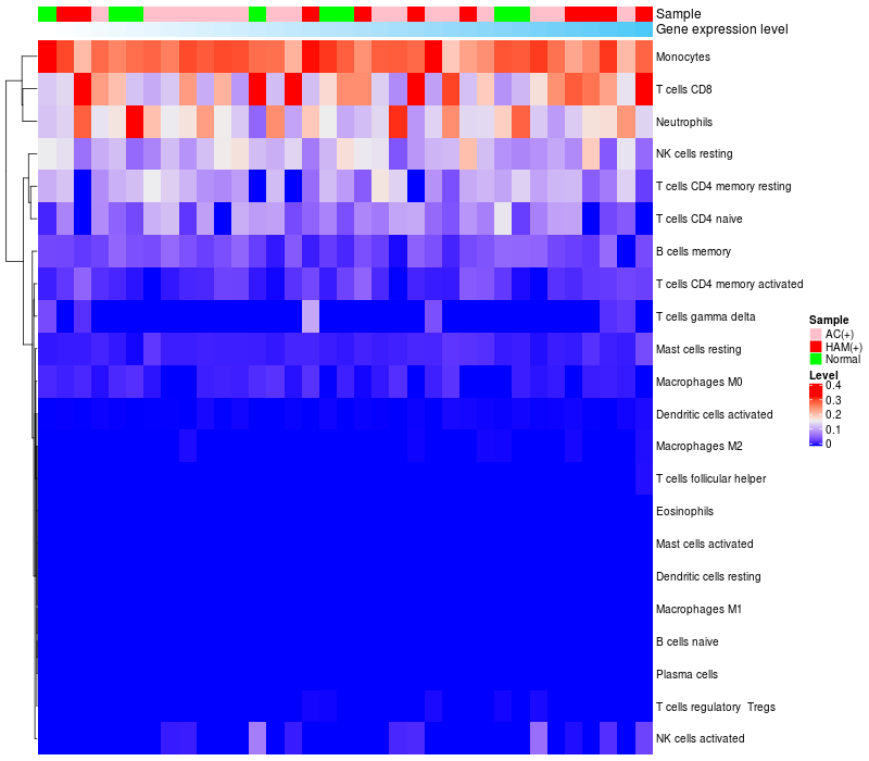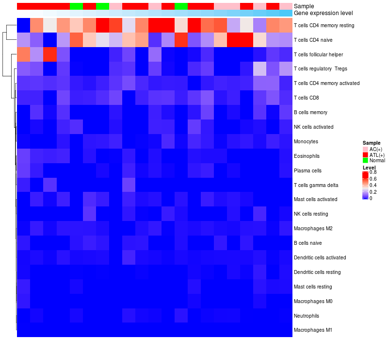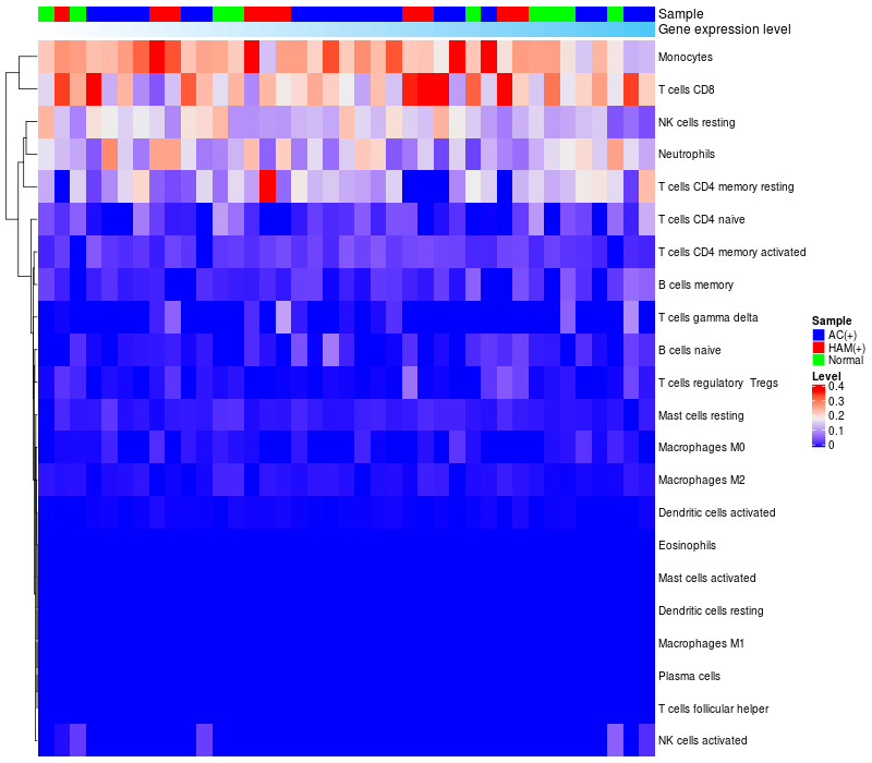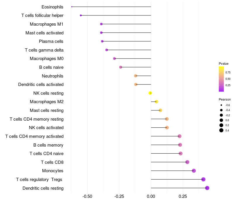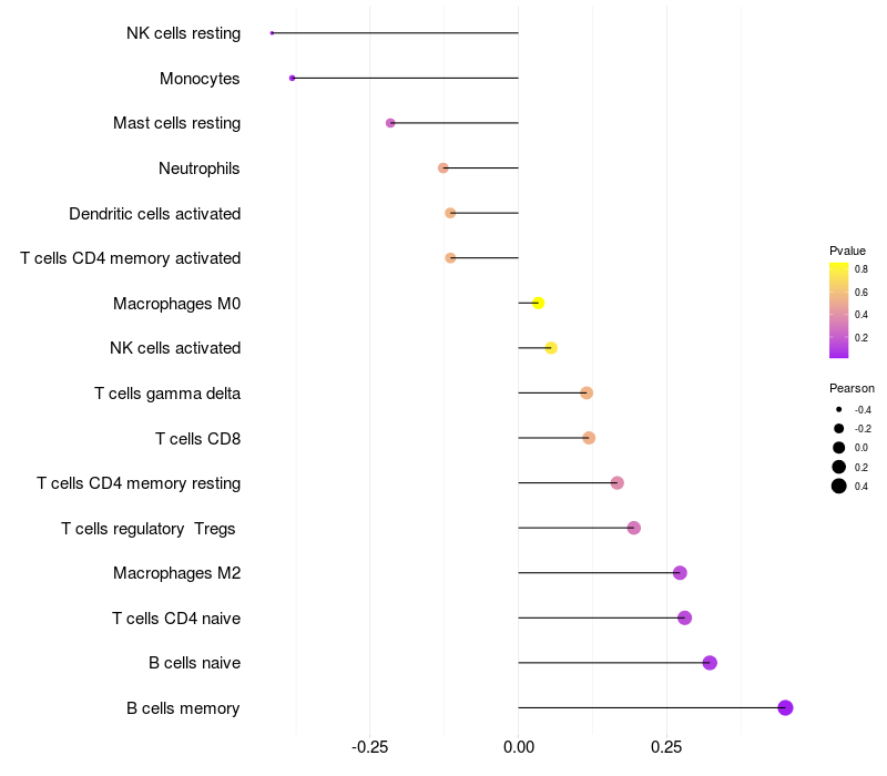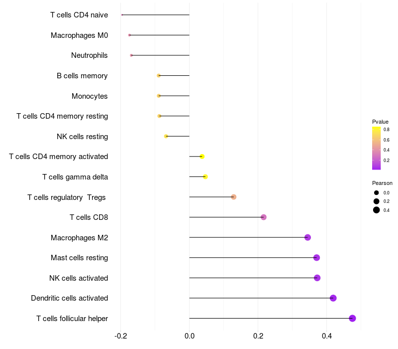 Lollipop of ZNF85 expression and immune infiltrating cell level correlation result in HTLV1+ samples