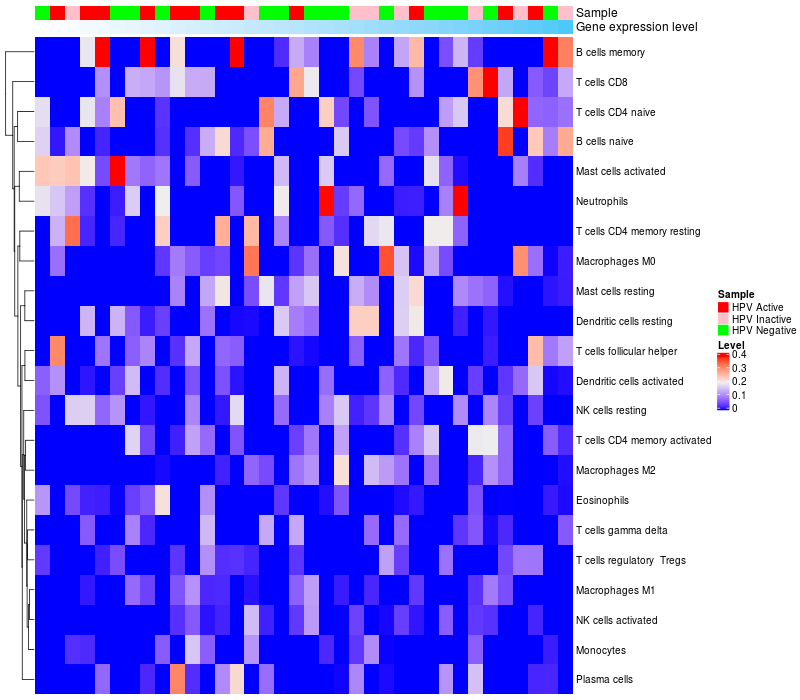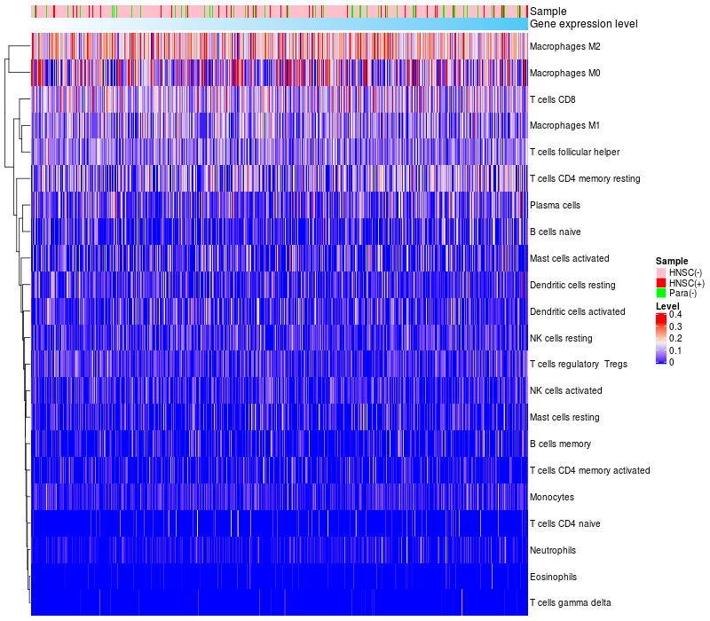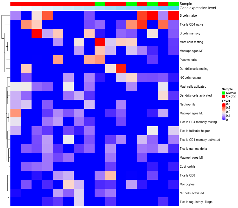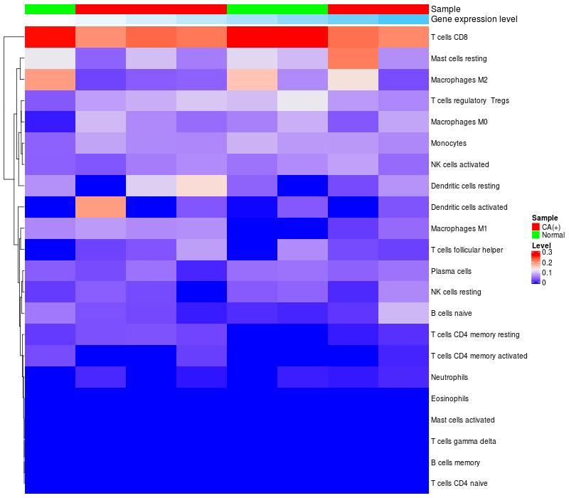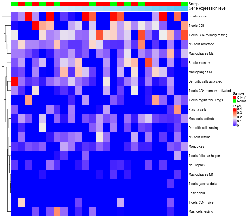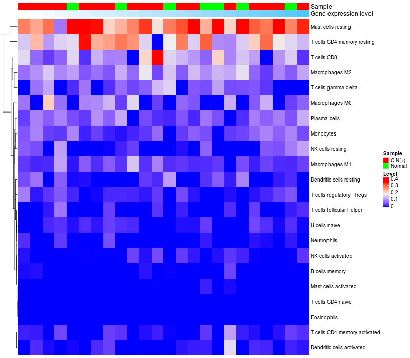• Left: Heatmap of target gene expression and the level of various types of immune cells (cell type fractions) in all samples based on CIBERSORT method.