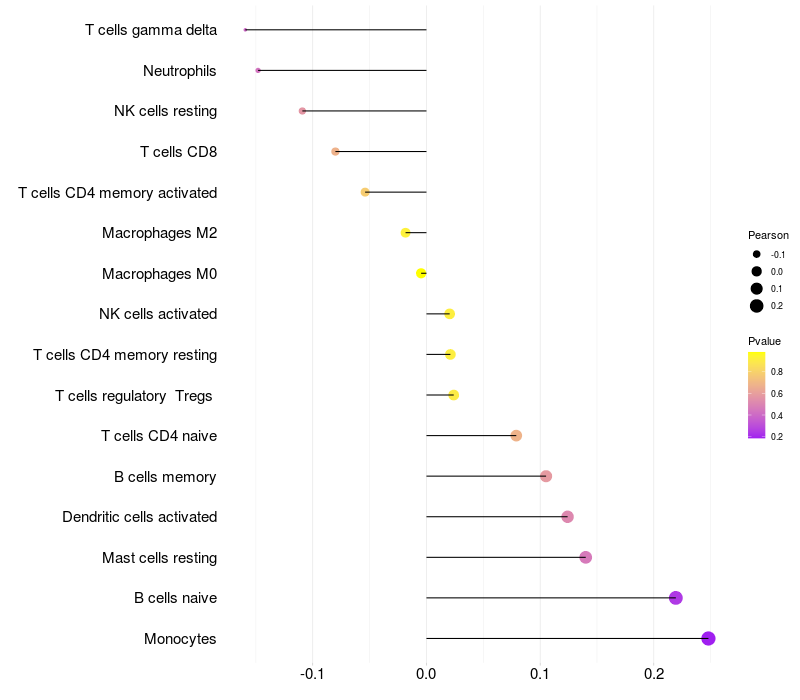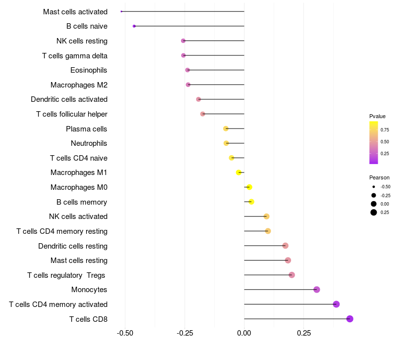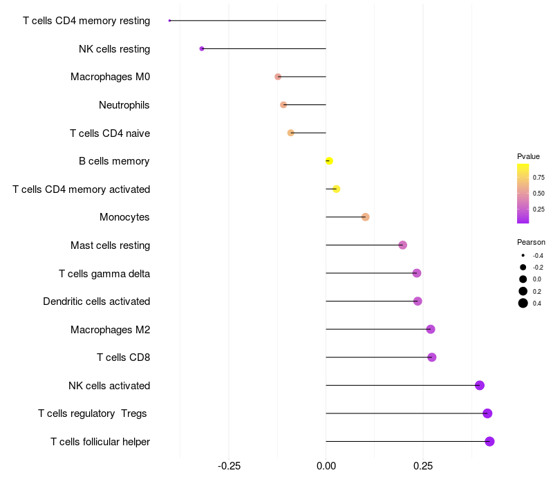 Lollipop of ZSCAN1 expression and immune infiltrating cell level correlation result in HTLV1+ samples