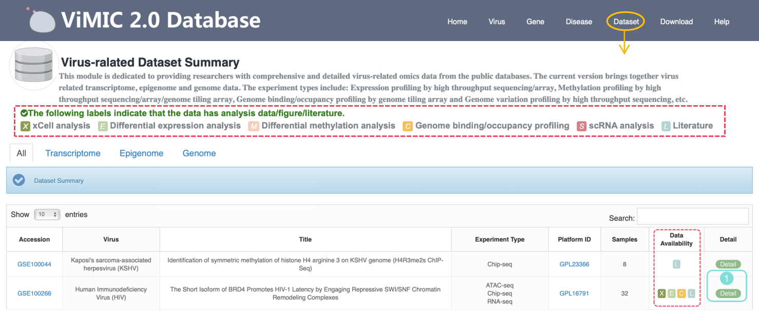 Data Availability column indicates that the data provided by this dataset can be analyzed. In ViMIC 2.0, only basic information of the dataset is displayed for data that cannot be processed or analyzed. We also designed corresponding classification labels: X represents xCell analysis, E represents Differential expression analysis, M represents Differential methylation analysis, C represents Genome binding/occupancy profiling analysis, S represents scRNA analysis, and L represents Literature. Click the Detail button to the detailed information page of the dataset, which provides basic information about the dataset, including the experimental design of each sample. Click the corresponding Download button to download the data results of the corresponding omics analysis.