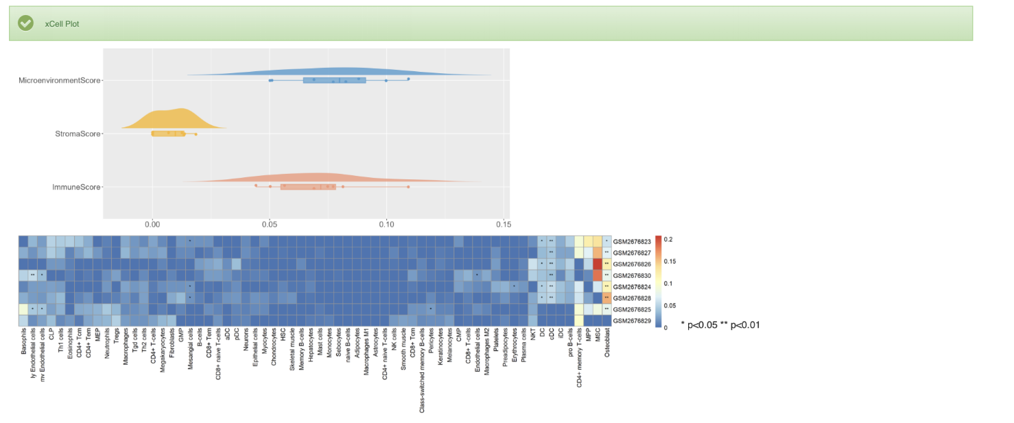 1. For bulk RNA-seq, ViMIC2.0 provides xCell's immune cell infiltration analysis results, heatmap, and microenvironment score cloud-rain map.