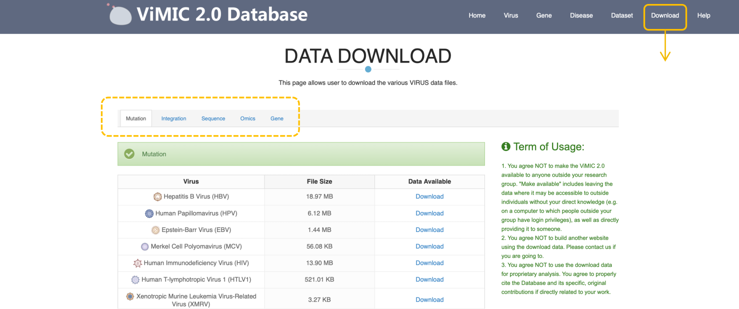 The ViMIC 2.0 allows the user to download the various virus data files including mutation, integration, sequences annotation, omics and target gene.