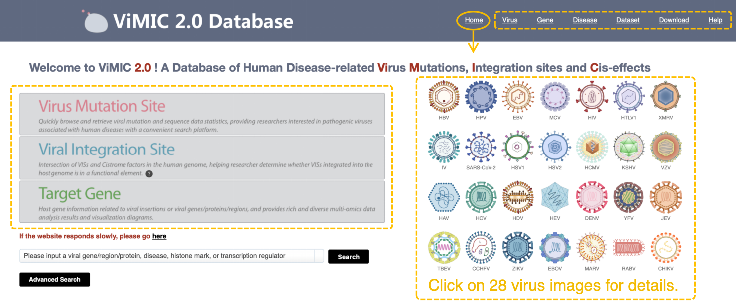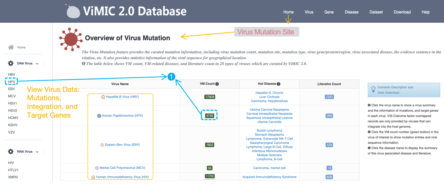 The homepage of ViMIC 2.0 mainly gives a navigation of our database, including listing the modules of ViMIC 2.0 on menu bar and upper right panel, to help users to browse, search, visualize and download data. Main modules on upper left consist of Virus Mutation Site, Viral Integration Site and Target Gene. Other modules consist of Virus (virus information overview), Gene (target gene summary and analysis), Disease (virus infected disease information), Dataset (virus related omics dataset), Download (ViMIC 2.0 data download) and Help (ViMIC 2.0 data statistic and help document).