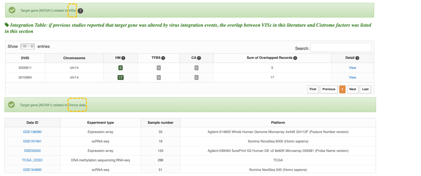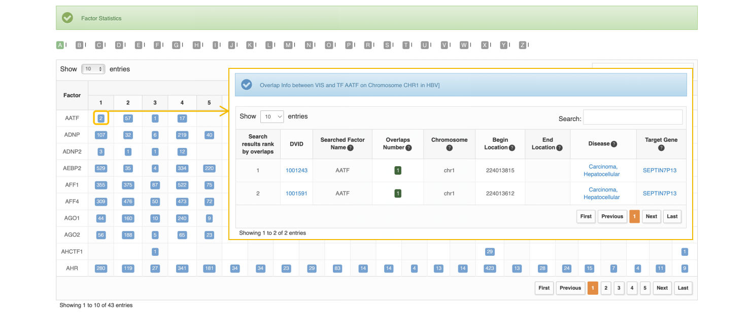 An ‘Overlapped Records’ means a match between VIS and 1 of 3 Cistrome factor (histone modification, transcription factor binding site and chromatin accessibility), more specifically, this match includes at least 1 overlap between this VIS and 1 Cistrome factor-related sample from 1 of 3 Cistrome factor data. So, one VIS may have several overlaps with multiple Cistrome factor-related samples, the associated factor and overlap number of samples could indicate that the virus integration site is a potentially functional DNA element. The interface details are as follows: