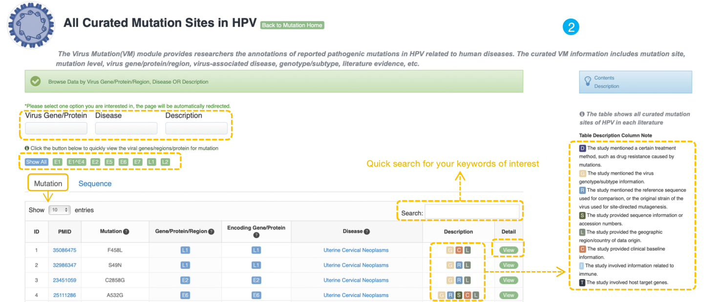 When selecting the virus gene of interest, users can quickly search the keyword of interest in the search box on the top-right of the table. Click the "View" button to show the detail information of this mutation.