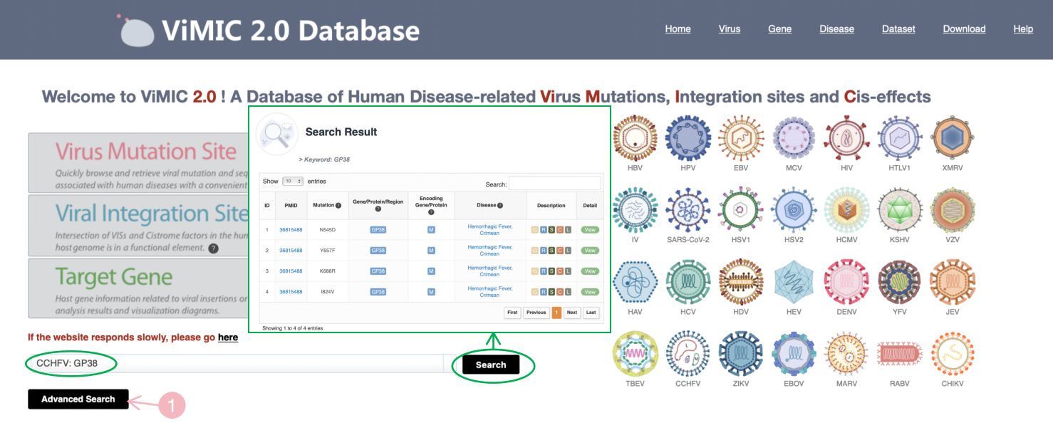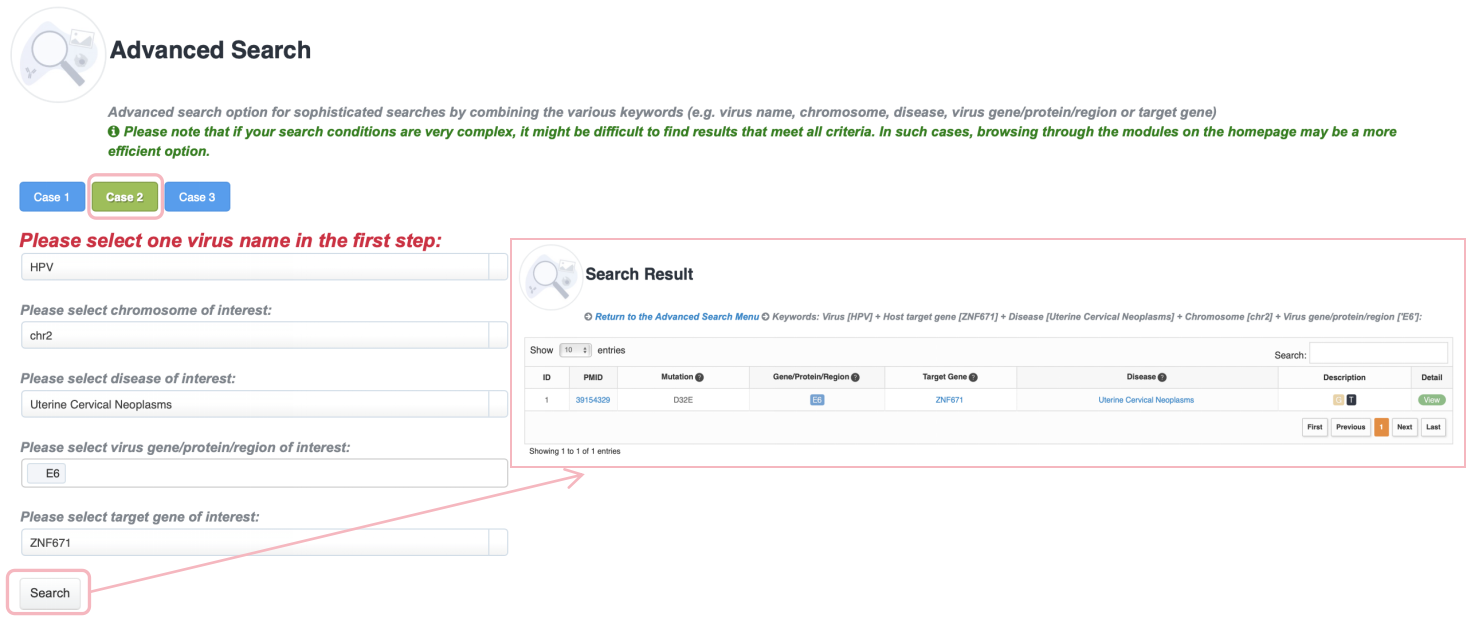 Advanced search option for sophisticated searches by combining the various keywords (e.g., virus name, chromosome, disease, virus gene/protein/region or target gene). ViMIC 2.0 provides three search examples. Please note that if your search conditions are very complex, it might be difficult to find results that meet all criteria. In such cases, browsing through the modules on the homepage may be a more efficient option.