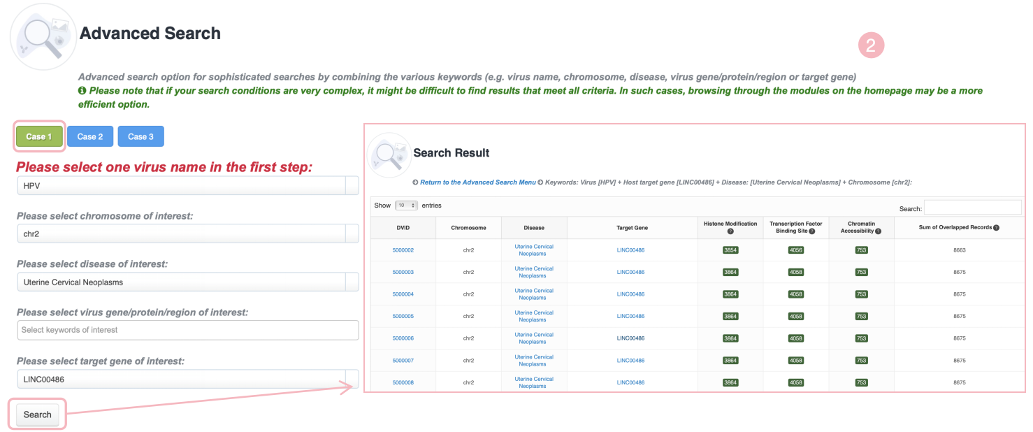 Advanced search option for sophisticated overlapped records searches by combining various keywords (e.g. virus name, chromosome, location, disease, Cistrome biological source or Cistrome type). Specifically, the user can combine keywords of related disease and biological resource to filter out overlapped records of interest.