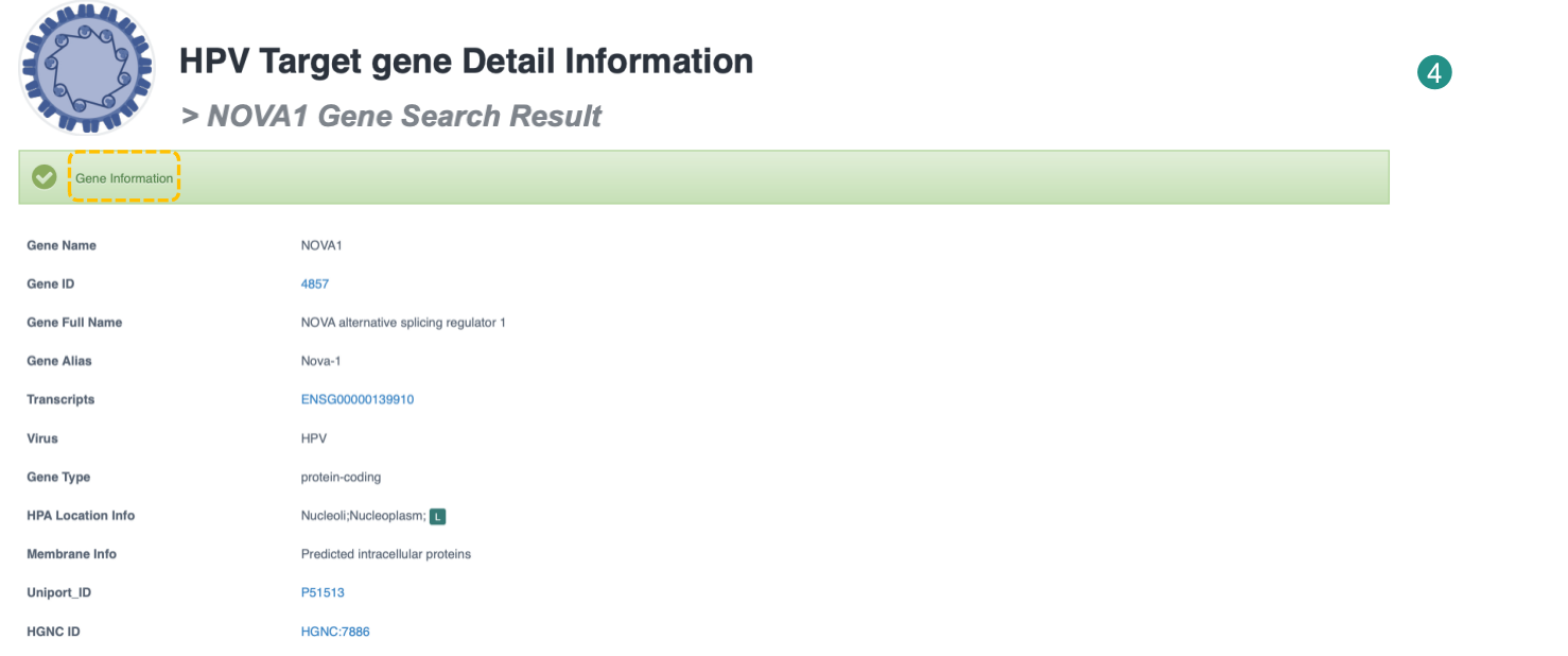 Using the NOVA1 gene from HPV research as an example, we've segmented the data by initial letter to speed up access. Click the letter "N" to search for NOVA1 in the upper right corner of the table. Click the "View" button for the corresponding virus to view detailed information.