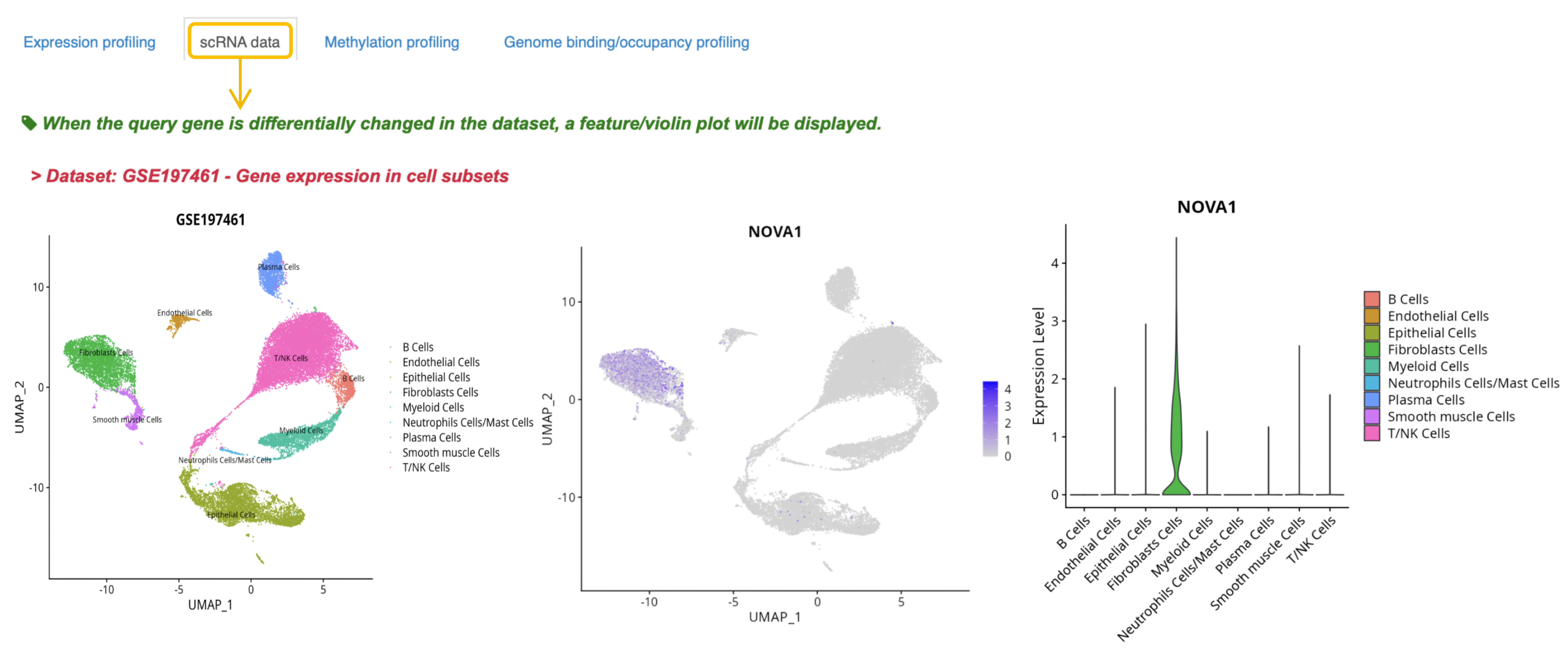 2. If the gene is differentially expressed in a cluster of single-cell transcriptome data, the sample and cell annotation UMAP and gene feature plot are displayed below.