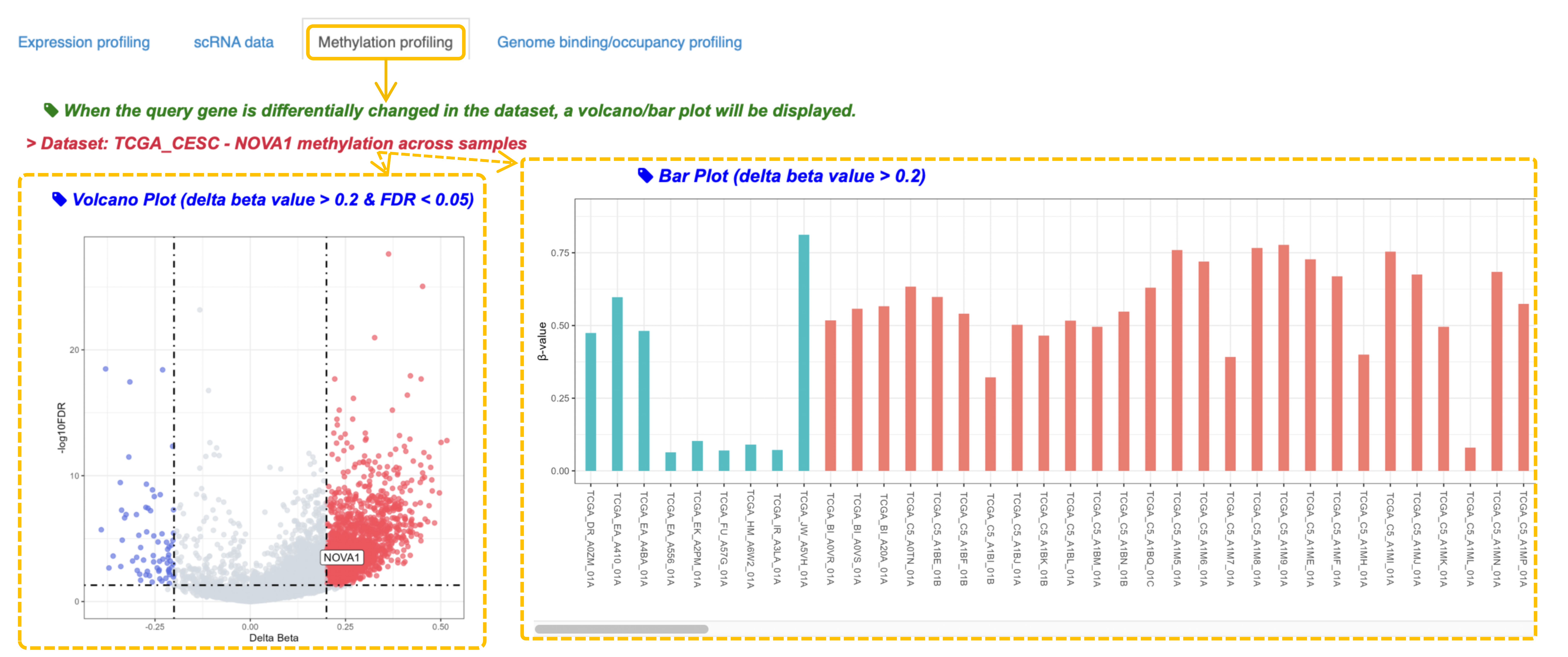 3. If the gene contains differentially methylated sites, a volcano plot and a bar plot are displayed below.