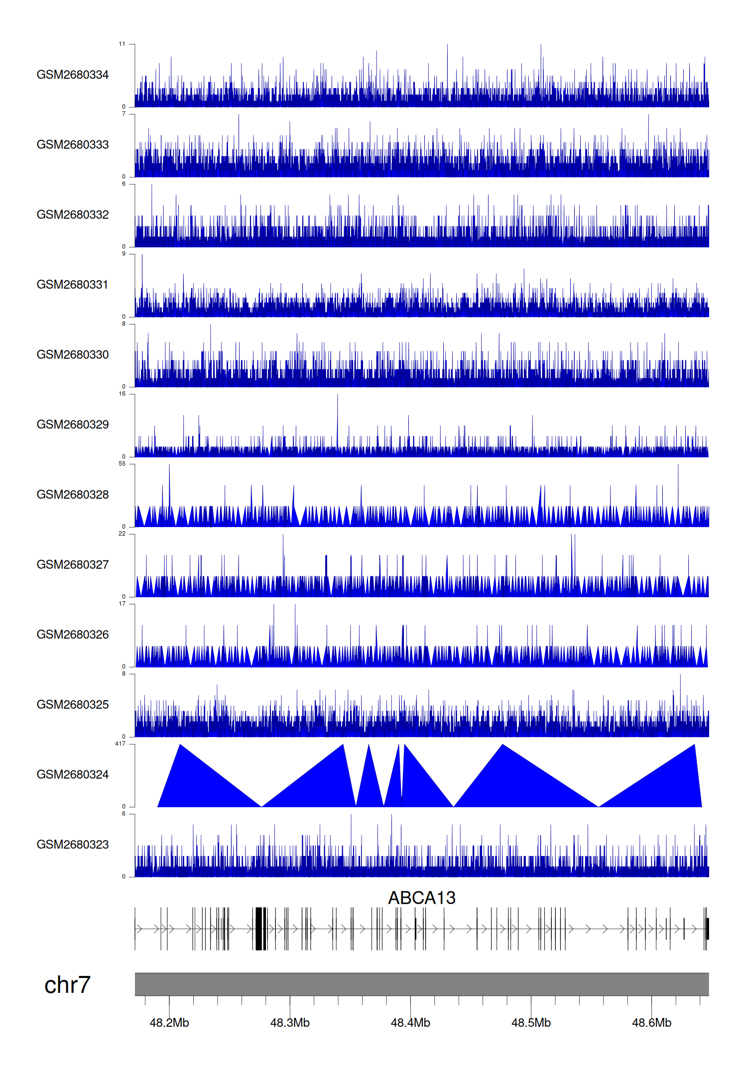> Dataset: GSE68402 - ABCA13 peak across samples