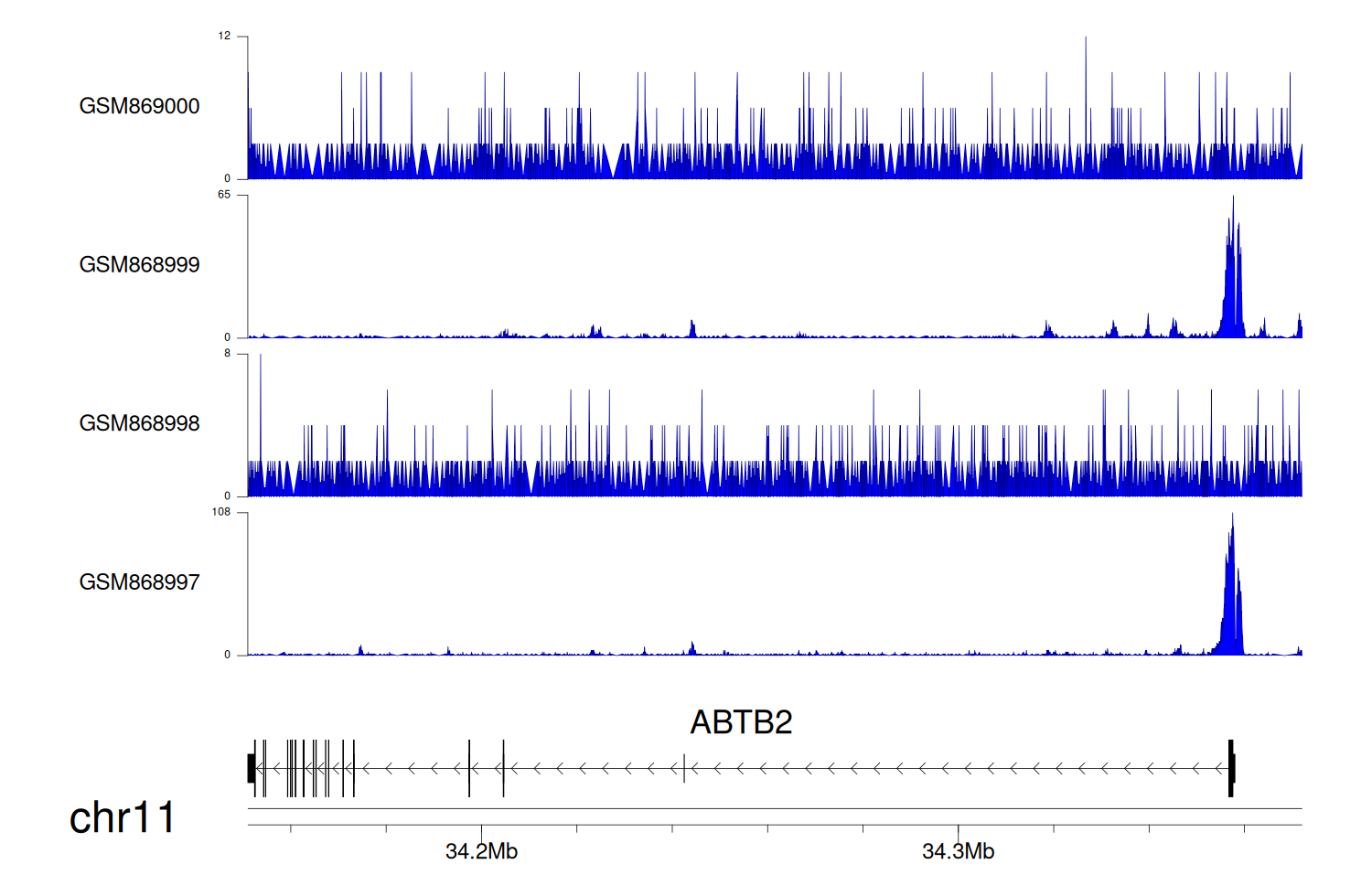 > Dataset: GSE35465 - ABTB2 peak across samples