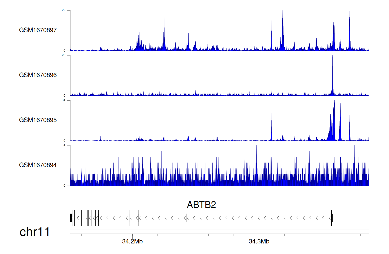 > Dataset: GSE68402 - ABTB2 peak across samples