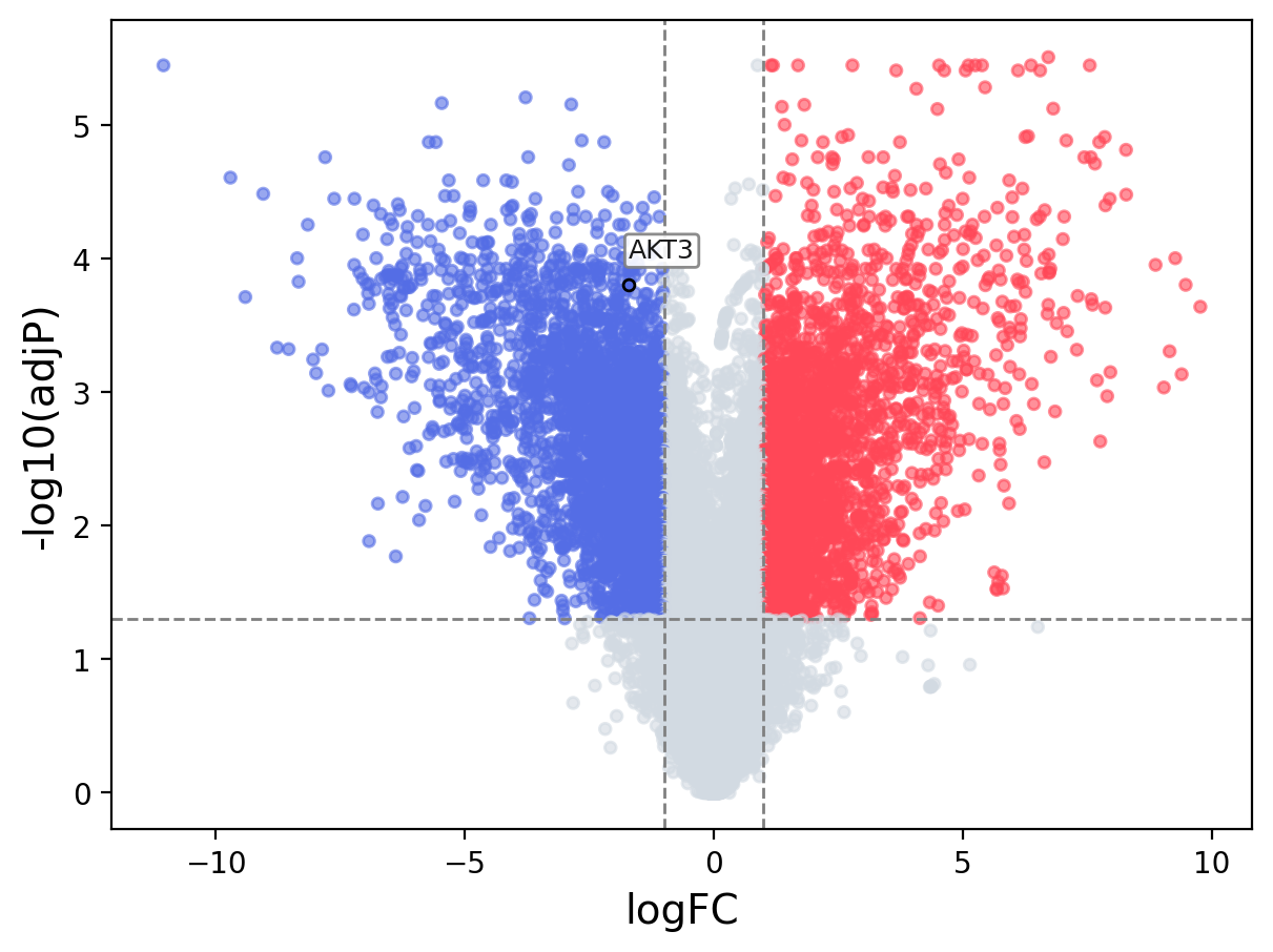 When the query gene is differentially changed in the dataset, a volcano/bar plot will be displayed.