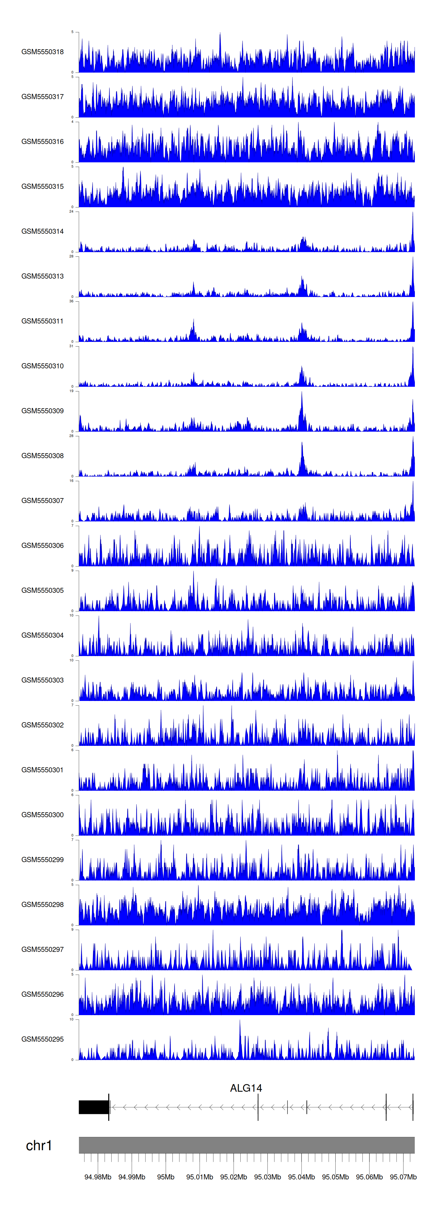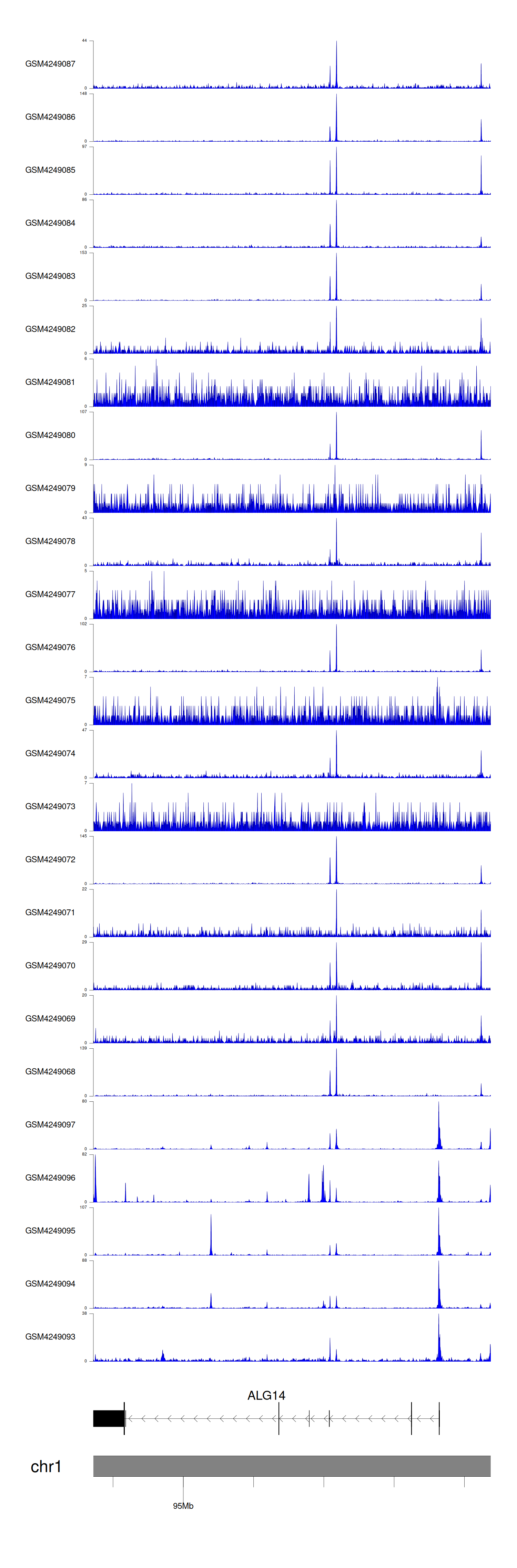 > Dataset: GSE143026 - ALG14 peak across samples