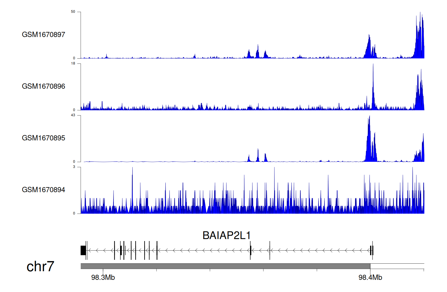 > Dataset: GSE68402 - BAIAP2L1 peak across samples
