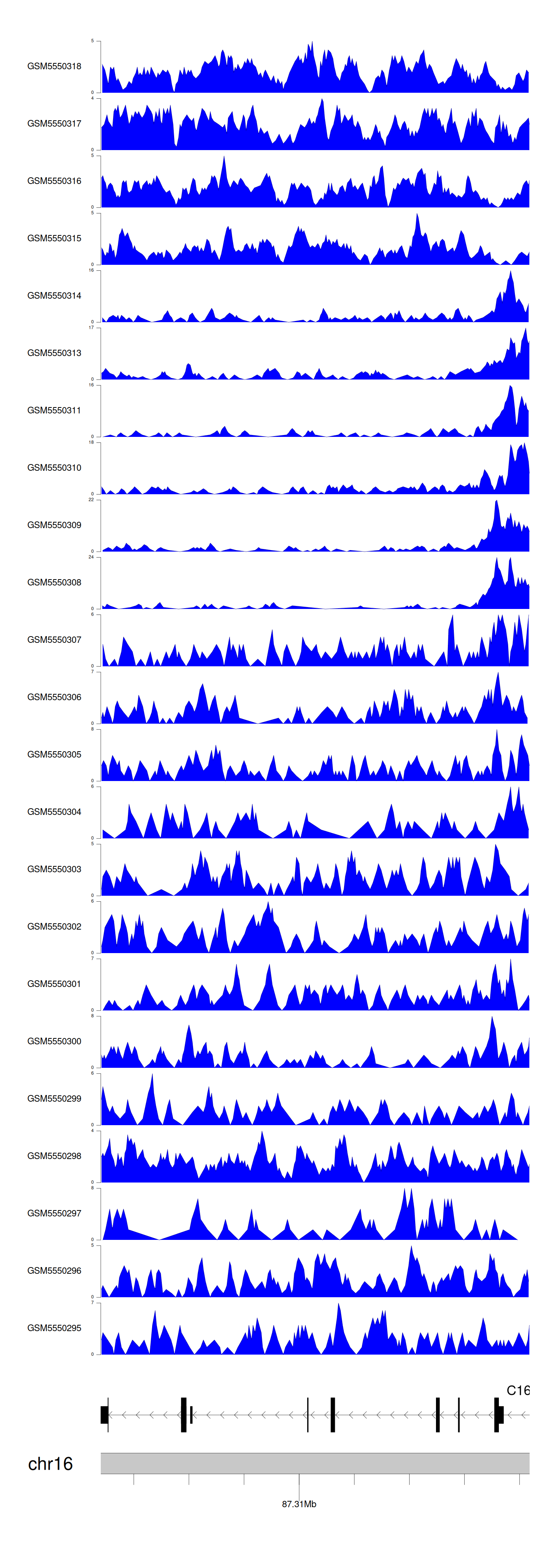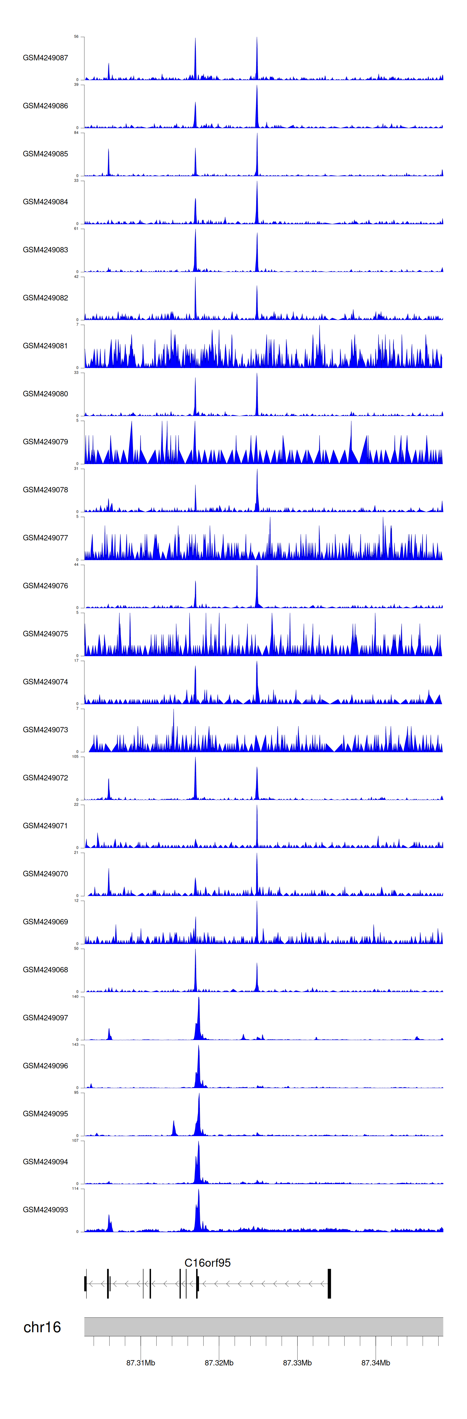 > Dataset: GSE143026 - C16orf95 peak across samples