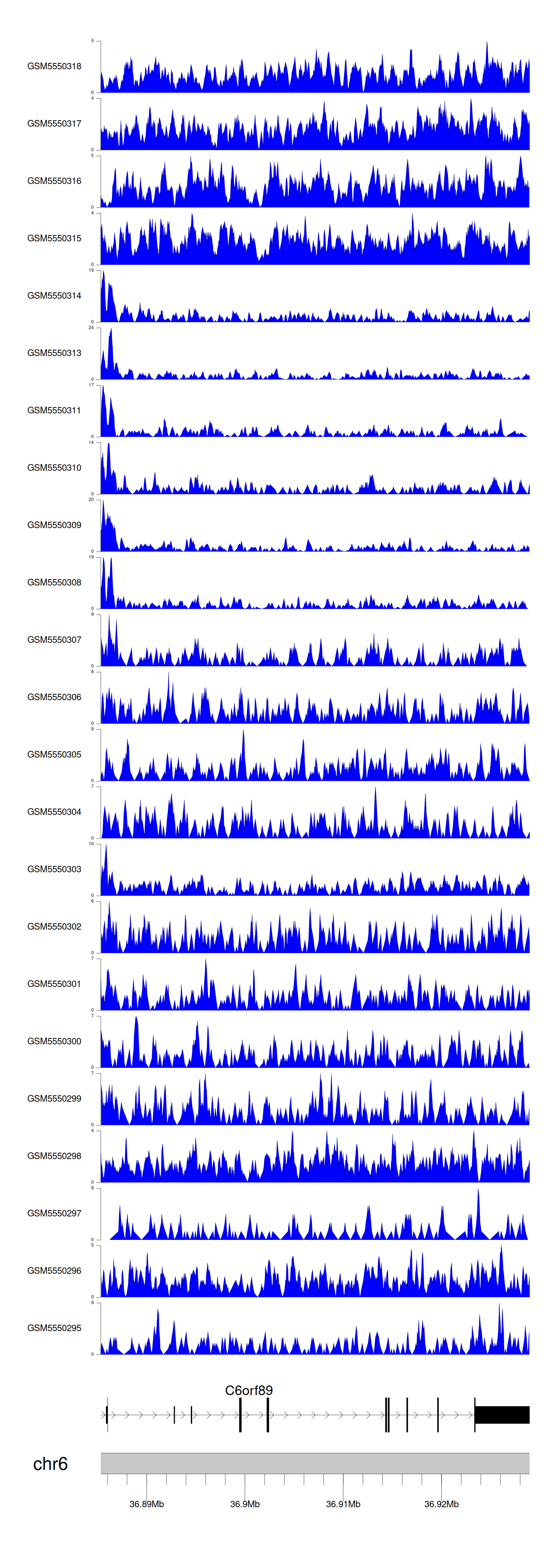 > Dataset: GSE143026 - C6orf89 peak across samples