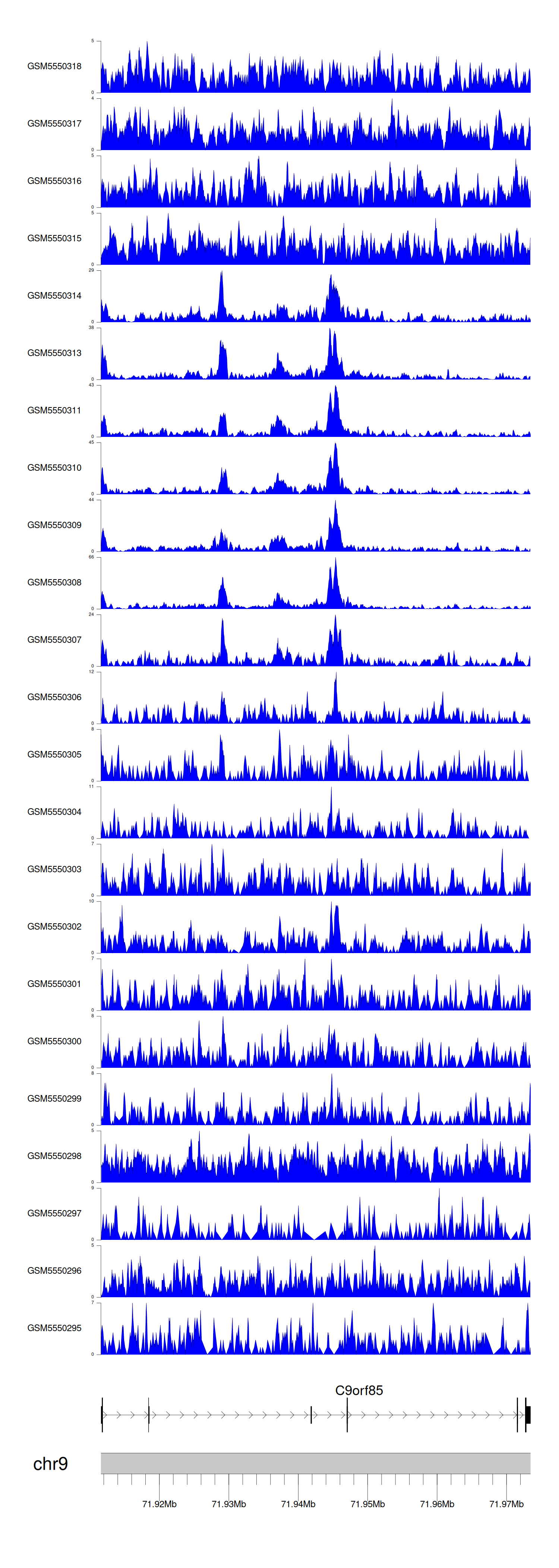 > Dataset: GSE143026 - C9orf85 peak across samples