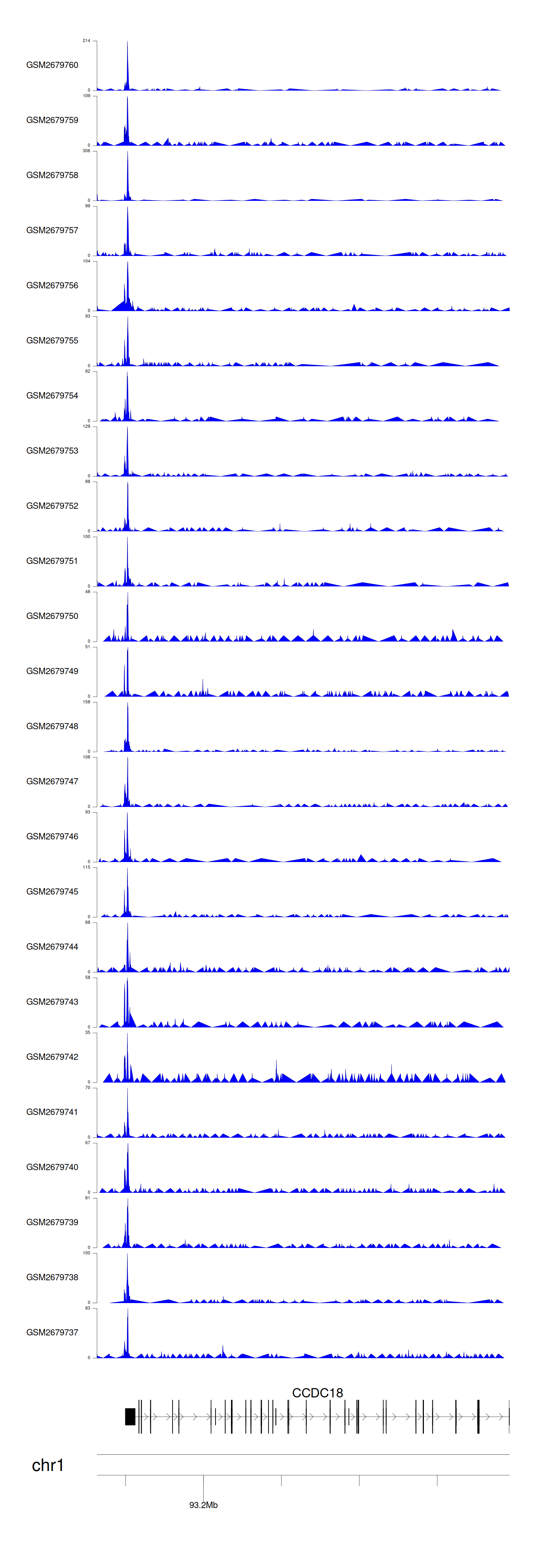 > Dataset: GSE100376 - CCDC18 peak across samples