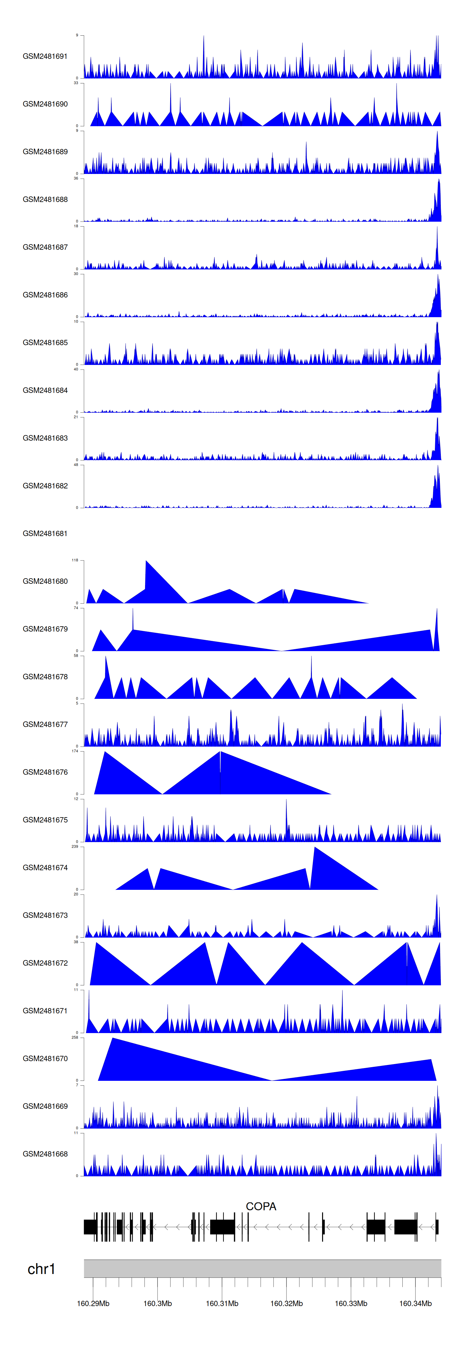 In eukaryotic cells, protein transport between the endoplasmic reticulum and Golgi compartments is mediated in part by non-clathrin-coated vesicular coat proteins (COPs). Seven coat proteins have been identified, and they represent subunits of a complex known as coatomer. The subunits are designated alpha-COP, beta-COP, beta-prime-COP, gamma-COP, delta-COP, epsilon-COP, and zeta-COP. The alpha-COP, encoded by COPA, shares high sequence similarity with RET1P, the alpha subunit of the coatomer complex in yeast. Also, the N-terminal 25 amino acids of alpha-COP encode the bioactive peptide, xenin, which stimulates exocrine pancreatic secretion and may act as a gastrointestinal hormone. Alternative splicing results in multiple splice forms encoding distinct isoforms. [provided by RefSeq, Jul 2008] |