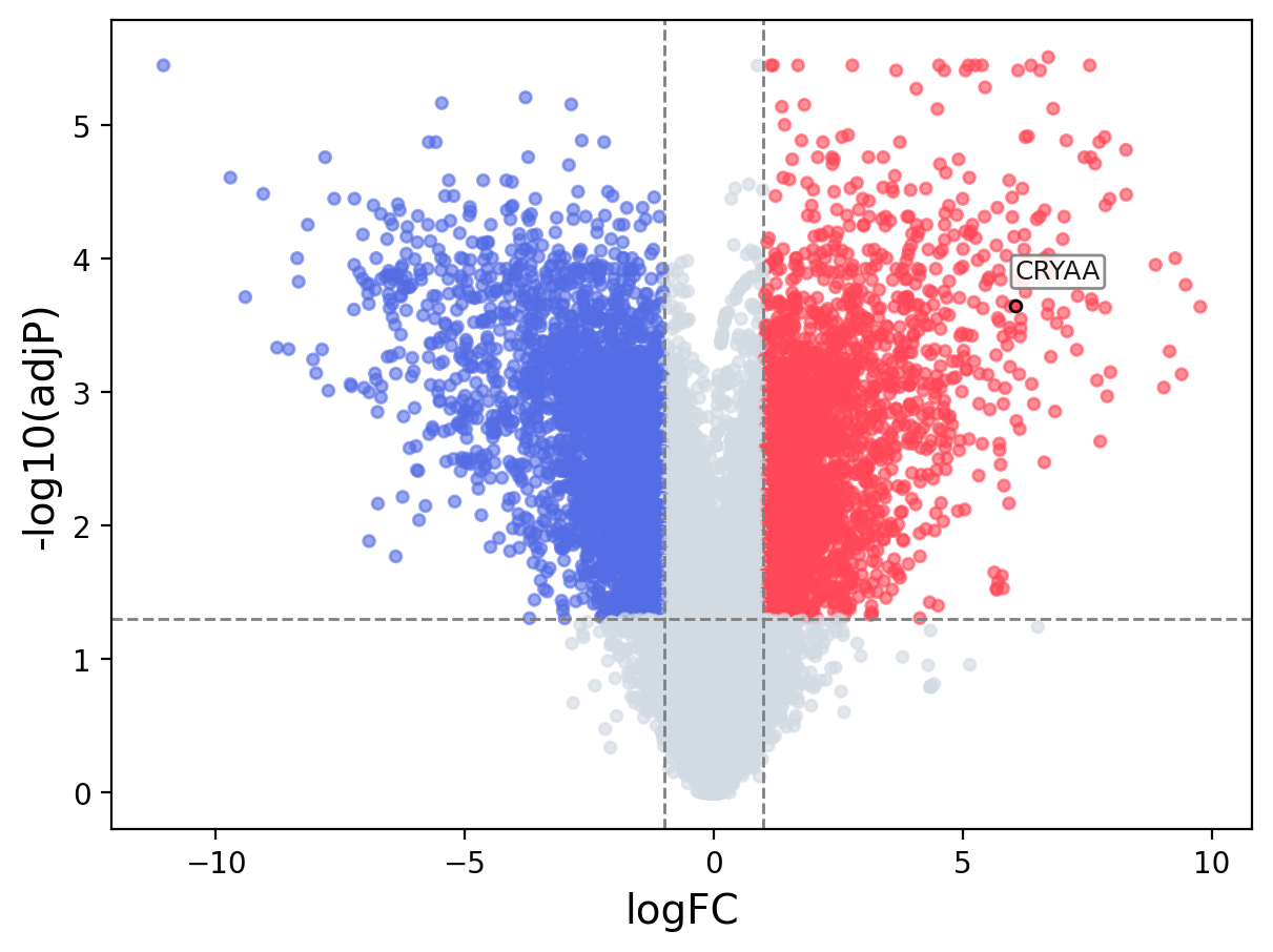 When the query gene is differentially changed in the dataset, a volcano/bar plot will be displayed.