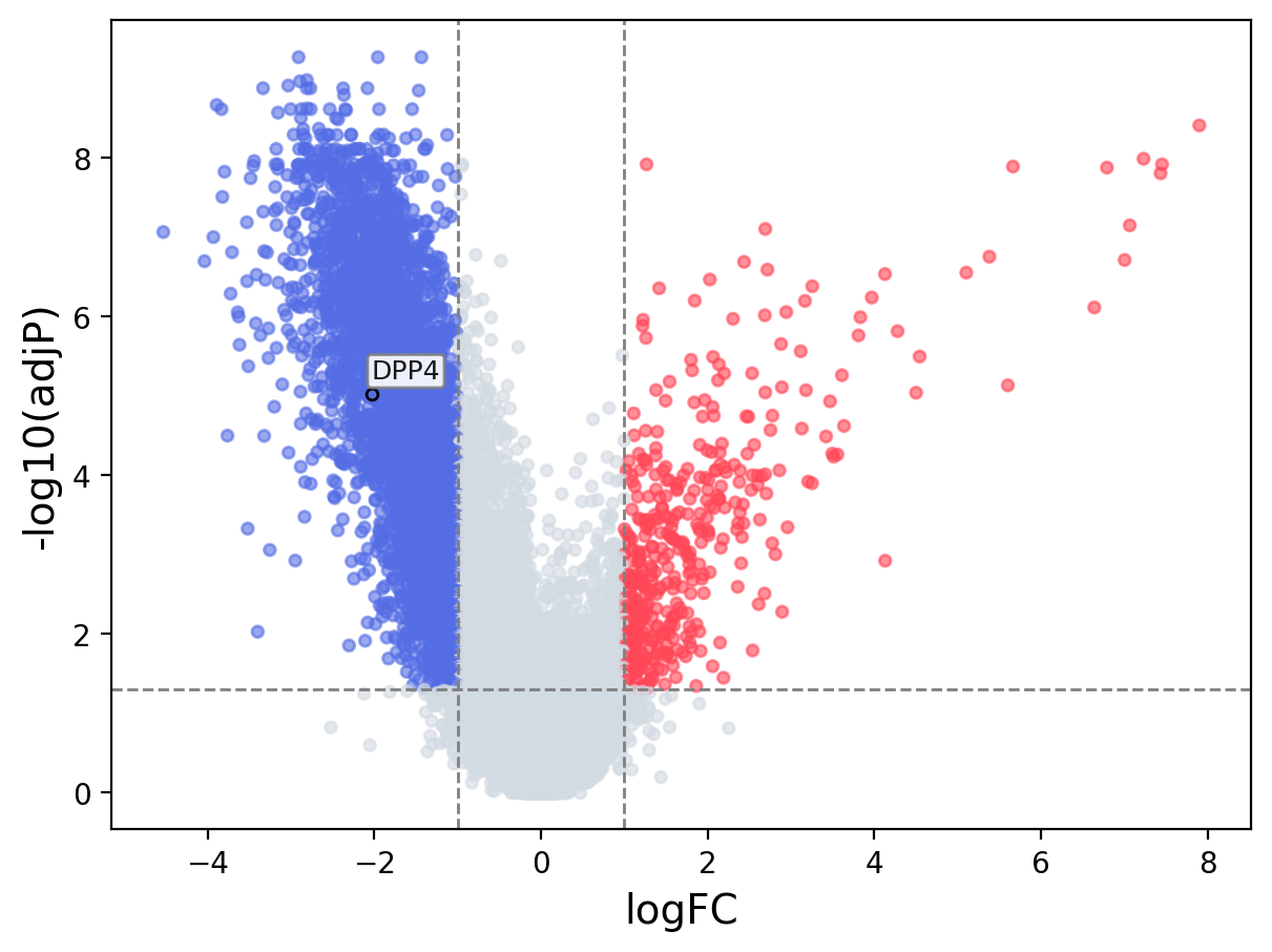 When the query gene is differentially changed in the dataset, a volcano/bar plot will be displayed.