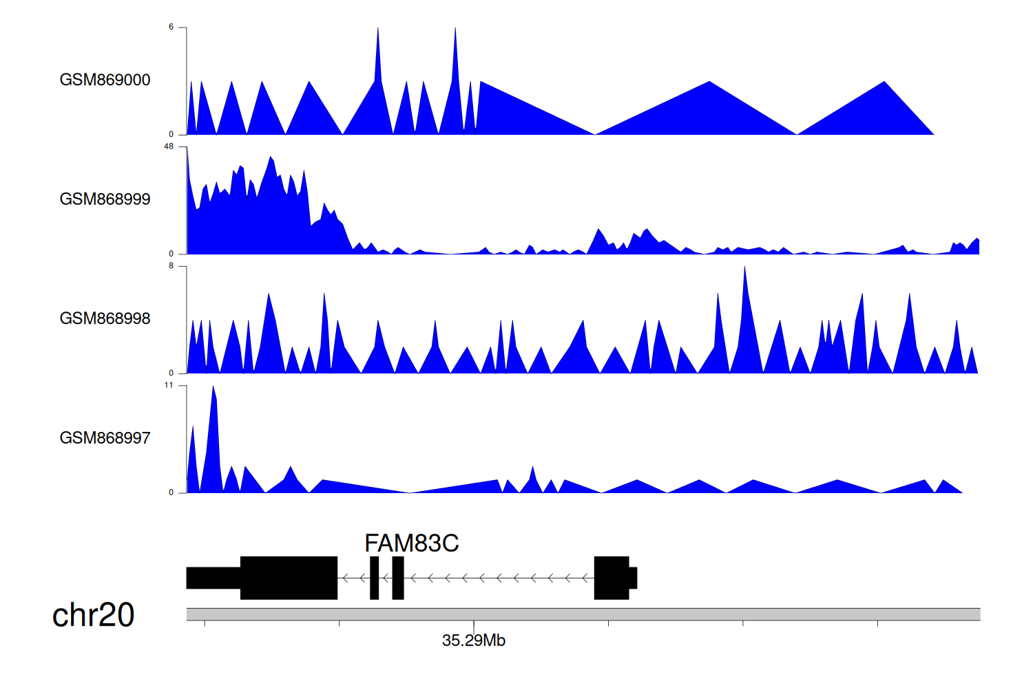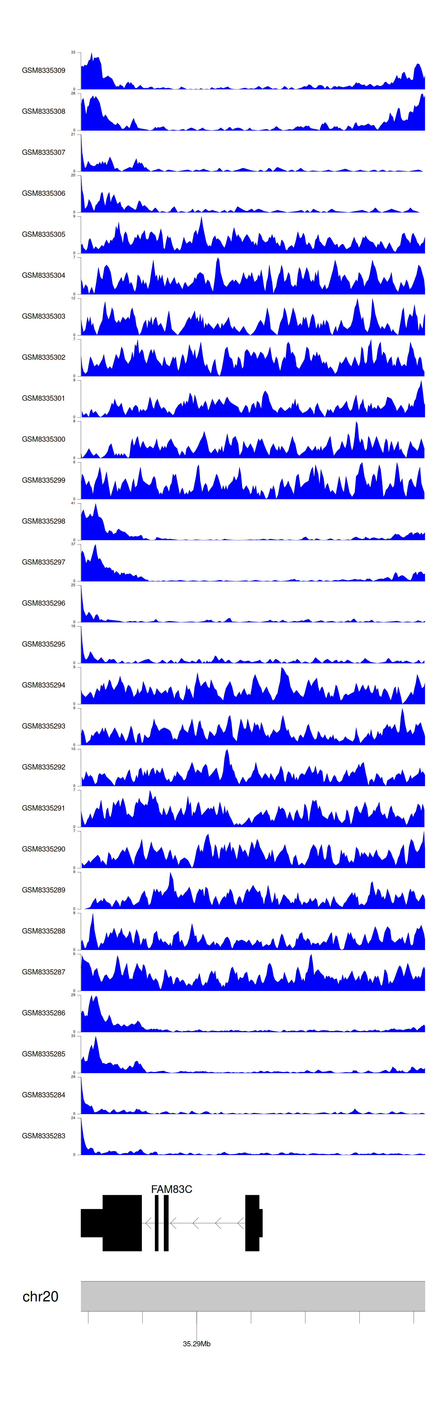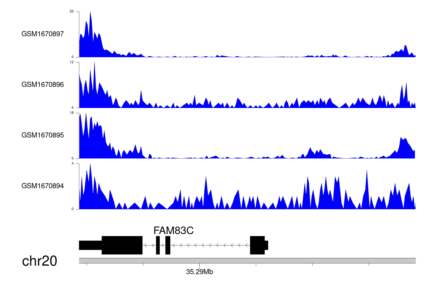 > Dataset: GSE35465 - FAM83C peak across samples