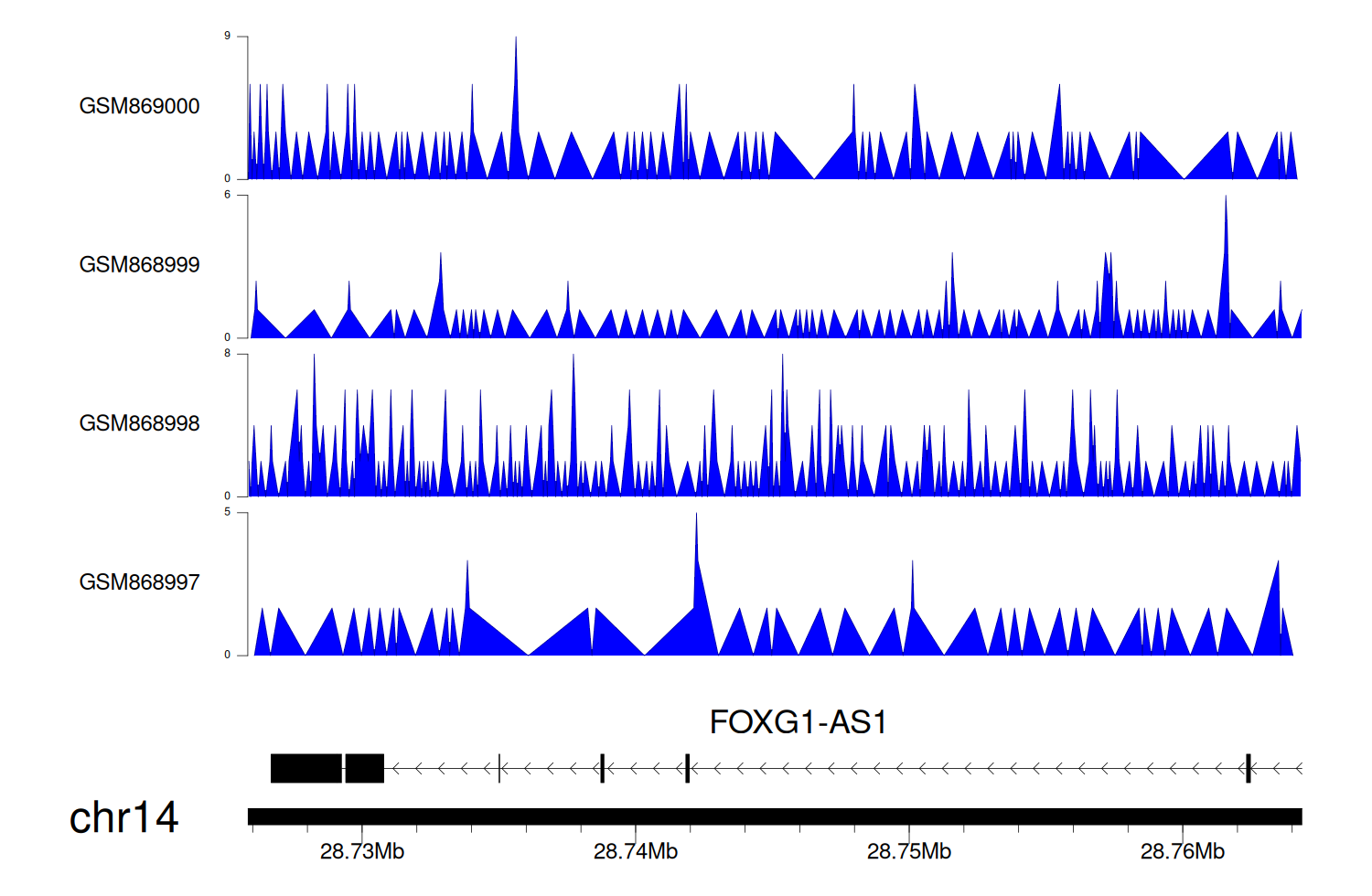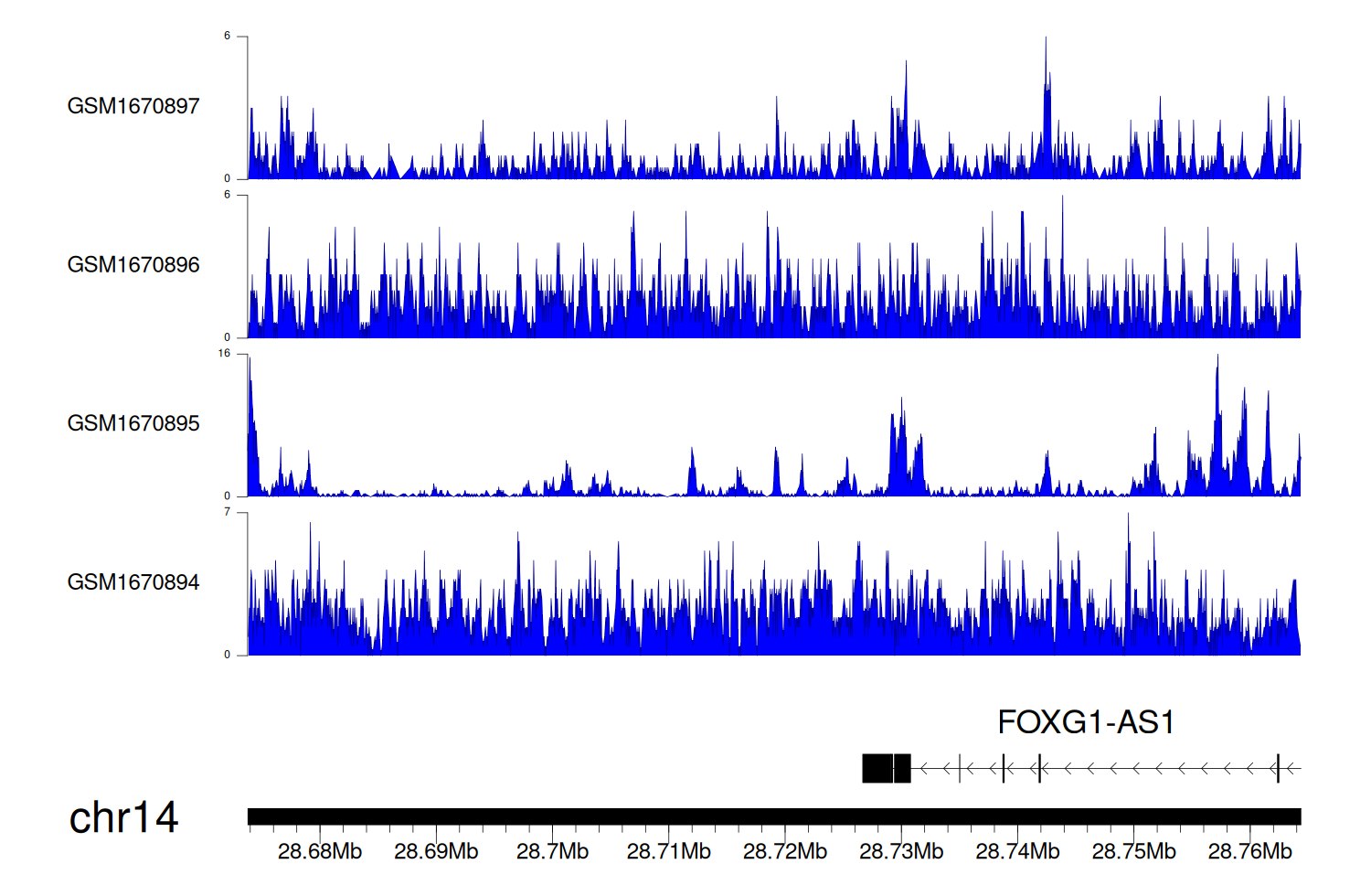 > Dataset: GSE68402 - FOXG1-AS1 peak across samples